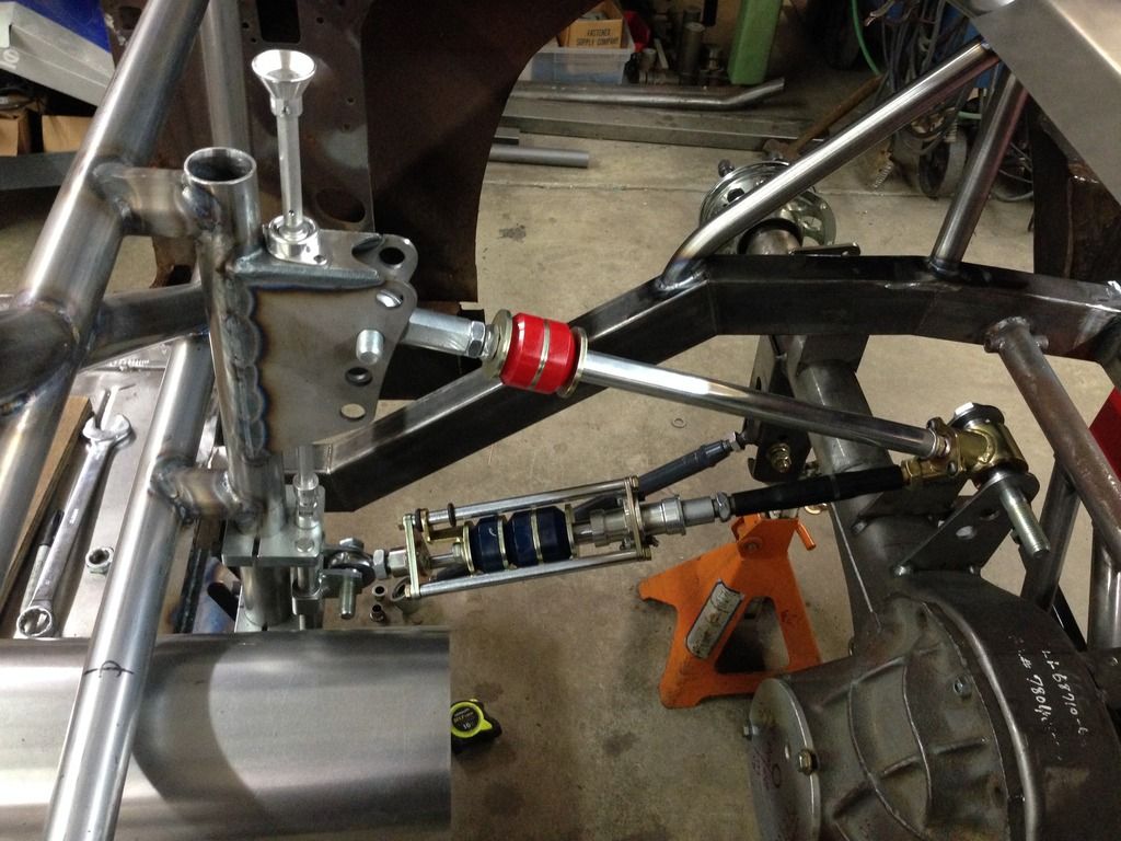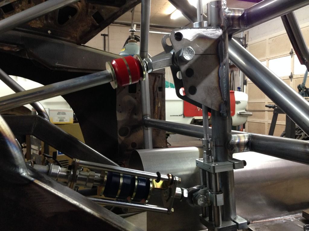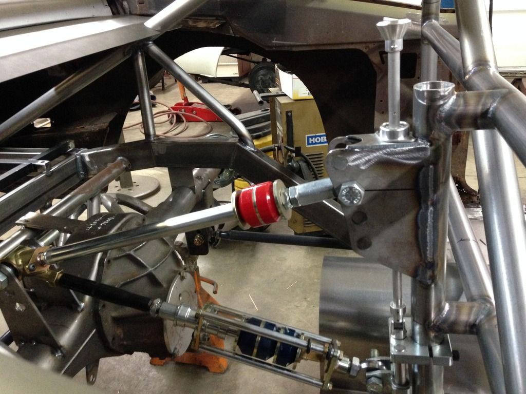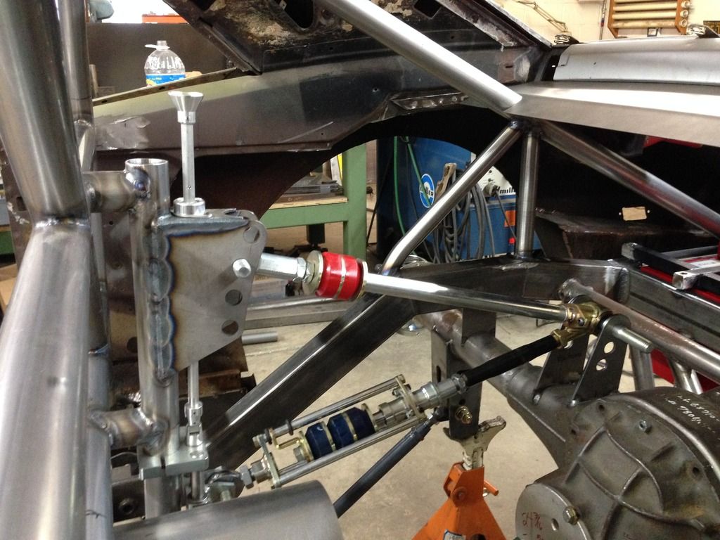 For those not familiar, this is an offset, decoupled three link. The reason to offset the top link is to counteract the torque transmitting through the rear end housing. With all 4-link, centered 3-link, truck arm, torque arm, leaf spring style rear suspensions there is a significant amount of torque steer. The friction of the bearings & gear mating surfaces in the rear end cause power loss ... in the 7-12% range. Due to the friction drag, that 7-12% power goes into rotating the rear end housing down onto the left rear tire & up off the right rear tire. This causes uneven tire loading. The LR tire gets 7-12% more loading ... and therefore 7-12% more grip ... than the RR tire. This causes cars to have more grip on the exit of LH corner & less grip on the exit of RH corners. With a 3-link ... if we offset the top link to the passenger side the correct amount ... we neutralize the torque steer. When done correctly, the car now has the same torque applied to both rear tires for even grip on corner exit, regardless if LH or RH corner. We can't do this practically with other styles of rear suspensions. The decoupled part is ultra bad ass. Because it is the only rear suspension version where we can have it all ... almost. In all 4-link, centered 3-link, offset 3-link, truck arm, torque arm, leaf spring style rear suspensions ... the instant center (swing arm pivot point) defines the anti-squat for corner entry handling & corner exit handling. If you move the instant center to increase anti-squat for increased corner exit grip ... you are affecting the corner entry handling ... the opposite direction ... moving it toward loose handling on corner entry. With any 3-link or 4-link track car, we're typically adjusting the top link(s) down at the front chassis mount ... bit by bit ... to increase grip on corner exit ... until the car starts to get loose on corner entry. Then we adjust the front of the top link(s) back up just enough to not be loose on corner entry. It is always a compromise between corner entry grip & corner exit grip. This is the case with any rear suspension model, except a decoupled version. FYI: There are decoupled torque arms, but they don't have the advantages of the 3-link. So I only focus on decoupled 3-links. With a Decoupled 3-Link ... we have a dedicated top link for acceleration & a separate dedicated top link for deceleration. For short, we call them the "Accel Link & "Decel Link". The Accel Link only loads up under acceleration. You can see the blue bushings in the Accel Link photos. Under acceleration, the top of the rear end housing rotates back & pulls on the Accel Link ... and compresses those bushings. The instant center formed by that Accel Link determines the anti-squat ... and therefore the tire loading & grip ... on corner exit. Under deceleration, the top of the rear end housing rotates forward & pushes on the Accel Link ... and releases the load on those bushings. The shaft inside the Accel Link "free slides" forward on deceleration ... to the point there is gap between the bushings ... and therefore no load on that link. Under deceleration, just before the load is fully released on the Accel Link bushings ... the load is engaging the red poly bushings in the Decel Link. Under hard braking, the top of the rear end housing rotates forward and compresses the red bushings in the Decel Link. The instant center formed by that Decel Link determines the anti-squat ... and therefore the tire loading & grip ... on corner entry. This is completely independent of the Accel link. Under acceleration, as the top of the rear end housing rotates back & pulls on the Decel Link ... this releases the load on those bushings. The shaft inside the Decel link "free slides" back on acceleration ... to the point there is gap between the bushings ... and therefore no load on that Decel Link. It sounds complicated, but frankly it is pretty simple. I'm sure whoever came up with the original idea had sleepless nights figuring out. But once it is installed, it is simple to tune ... and bad fast. We typically set the Decel Link at 12°-15° uphill (to the front) and start with the Accel Link forming its instant center directly under the CG of the car. I love this next part ... Set the Decel Link as close to 15° as packaging will allow ... and forget it. From there we tune the Accel Link for optimum corner exit grip with no concern about how it affects the corner entry ... because it doesn't. Tuning: Need more corner exit grip? Place a 1/2" ratchet into the top of the adjuster cone you see in the photos & rotate clockwise to lower the front of Accel Link. Adjust it until you have optimum corner exit grip. If you go too far (getting "greedy" I call it) the car will push on corner exit. Simply turn the adjuster counter-clockwise until the push goes away. Easy-peasy. In summation ... In my experience, the offset, decoupled 3-link is the ultimate track car performance rear suspension. It allows the optimum grip on corner entry & corner exit, no torque steer & no impact on mid-corner handling. No other rear suspension can do all that. But there is a down side. It rides rougher on the street, as the poly bushings in the Decel Link add spring rate. I have some clients that run this set-up as a simple offset 3-link on the street, and swap in the Accel & Decel Links for track days. The 3 bolts & swap takes about 10 minutes. IMHO this is not a suspension for most ProTouring cars. For 95% street use, little to no fabrication and keeping the rear seat ... I prefer a Torque Arm or Triangulated 4-link rear suspension. If done right ... 3-links, Offset 3-Links & Offset/Decoupled 3-Links are for hardcore cars that prioritize track performance over everything else. But these require professional fabrication, roll bar or cage & eliminating the rear seat. :cheers: Quote: