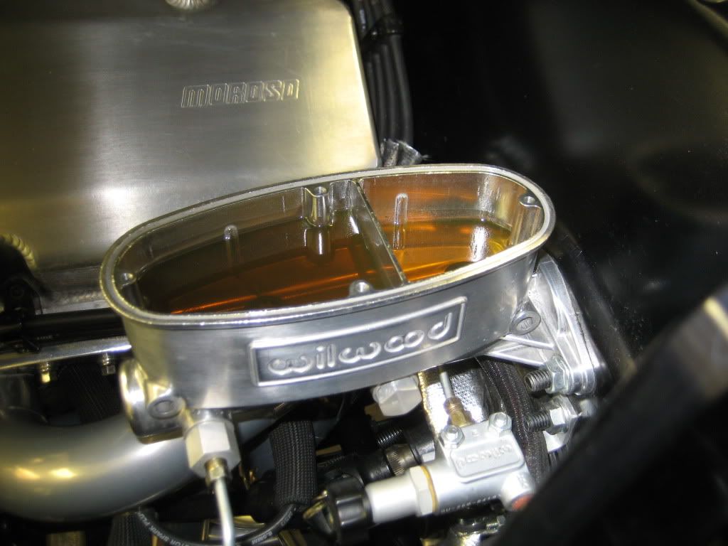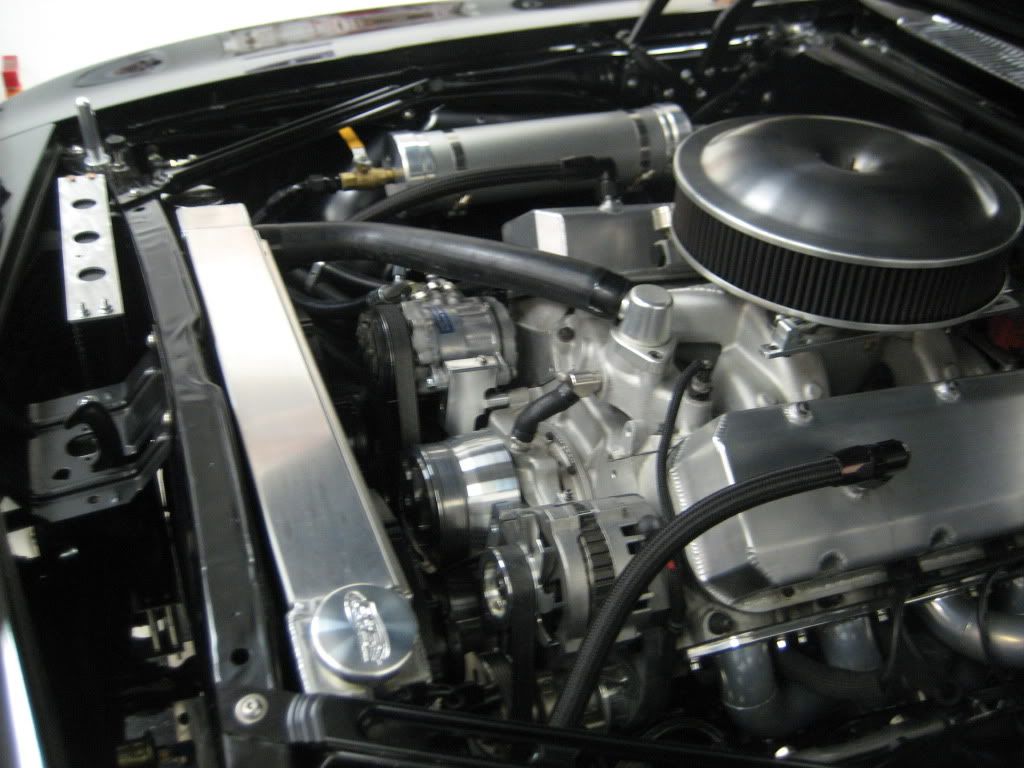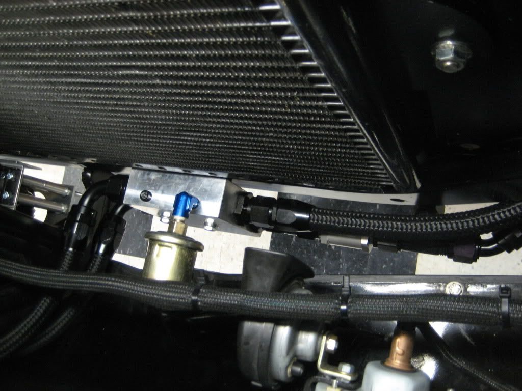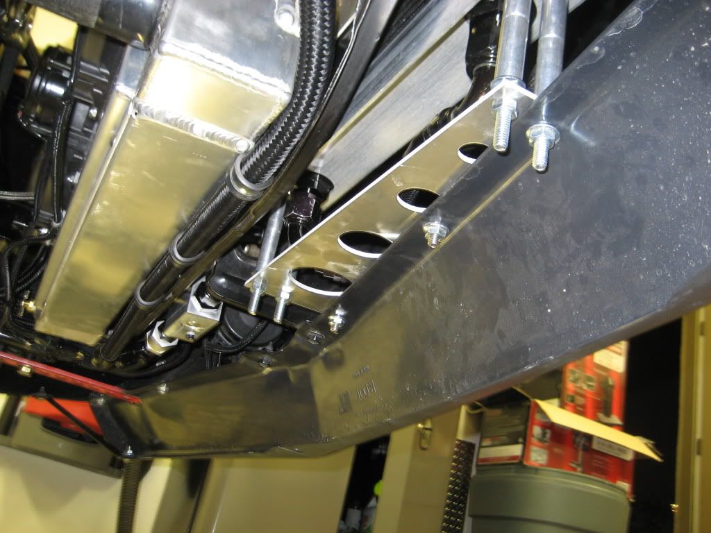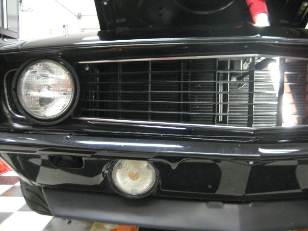 First, let me say that she's a dirty pig right now. I've been busting my ASS trying to get it ready for a local SCCA autocross tomorrow. Rumor has it that it's the biggest lot we've ever run in at the speedway. As most of you know, my oil temps were hitting 275 at Buttonwillow. That doesn't make a guy feel to warm and fuzzy. So in typical fashion, I buy the 2nd biggest oil cooler Earls makes.(50 or 52 row) It was like stuffing a square peg in a round hole. :willy: I built a bracket and the oil hoses wouldn't clear the front facia. I built that bracket on the same angle as the grill. Then I designed a bracket that would put the oil cooler square to the radiator. It turned out bitchin. I had to re do my entire oil system. I moved the sender out to the oil t-stat. The oil lines go in around the Z bar area and it's a tight bitch with the 2 1/8" headers coming in to clear the steering shaft. I'm stoked with how it turned out. I'm going to redo the top aluminum cover plate and the hardware will change. I just flat ran out of time. My oil pressure is up 10-15% over the old set up. I don't know if it's from moving the sender or the heat exchanger was that restrictive. Dad and I took it around town today and it's definitely running 10-15 degrees cooler in traffic. I think it's going to work well in the summer and on the road course. I'm a little concerned with the cold weather cruise condition. I may fabricate up a cover for the oil cooler. The t stat is working but I think it's still doing some cooling just being full of oil. I switched over to Redline 15w-50 and it now takes 13 qts for an oil change. :rolleyes: