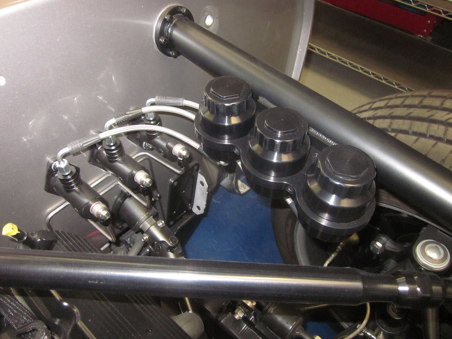 Got a new power steering reservoir we will be making tomorrow.. just got pcs from the machine shop.. The pass side reservoir is a new air oil separator that we will be testing on a car next week.. just used the bird for mock up.. http://i1015.photobucket.com/albums/...ps756d4229.jpg http://i1015.photobucket.com/albums/...ps6d6c3015.jpg http://i1015.photobucket.com/albums/...ps6f401b26.jpg Got the new brake reservoirs that Wilwood is now making… http://i1015.photobucket.com/albums/...ps7792269d.jpg The factory oil dip sticks needed some cosmetic enhancement… Use the factory tube.. cut it & silver solder a new end with shortened tube…. Cut the dip stick indicator & use our new t-handle… http://i1015.photobucket.com/albums/...ps2b1c7bb1.jpg http://i1015.photobucket.com/albums/...pse8f95a8c.jpg We got the rear section of the car assembled! Got a few more adjustments to do… http://i1015.photobucket.com/albums/...psf10a66b5.jpg |