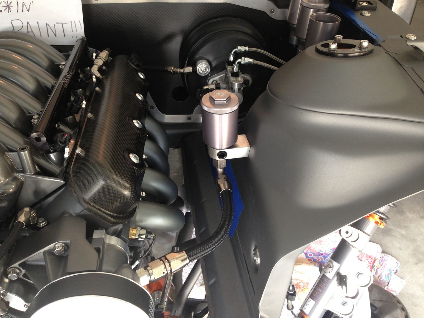 Justin flew to Wisconsin Wednesday and will be there for two weeks. He is helping Craig at Xtreme get the rear cradle done. Here are couple of pictures of the rear frame rails being mockup up. http://i1231.photobucket.com/albums/...psc0db9a86.jpg http://i1231.photobucket.com/albums/...ps6a4cffc5.jpg The new OZMO and NW TB are in. Jamie (Owner) said it's his favorite intake. The boys are still giving it their touch". Some guys can't leave well enough alone, LOL. Jamie is also milling a billet valley plate. Should be here in a week or so. http://i1231.photobucket.com/albums/...ps317168b1.jpg http://i1231.photobucket.com/albums/...psc31146d8.jpg http://i1231.photobucket.com/albums/...psd8d0af17.jpg The lines on the reservoir were replaced with crimped end for a cleaner look. (See the pictures on the top of the page to compare the difference) http://i1231.photobucket.com/albums/...ps5324d81e.jpg One of the implication with the new intake is the TB now sits higher and further forward. This created to steep of an angle downward from the TB to the air intake for the shorter distance. The solution is to push engine back 2" and lower it 1". The domino effect is that the radiator hose, motor mounts, trans mount, exhuast cross bracing, drive shaft will need to be modified. Currently the headers are the lowest point under the car. They sit about an 1.5" below the frame rail. To compensate for the engine drop a new set custom one off headers and exhuast setup is also part of the plan. When done the frame rails will be the lowest point. Seems like a lot of work but the added benefit will be the transfer of weight. Craig explained as a rule of thumb in racing every inch takes 100 lbs off front It might actually just be 75 lbs but 100 lbs is the rule of thumb. Lowering the center of gravity which should help. Still waiting on a few parts to start on version 2.0 of the track inspired engine. Drive sump pan, pump and dampener are in. Just waiting on the new track inspired cam and TD rockers. The Lingenfelter LS3 heads might also get replaced with Trick Flow new casting. Pat G likes them better the the Mast. Bill Dailey recommended to use two separate inline filter. A 75 micron from the pump to the tank. A 25 micron from the cooler to the engine. Justin design on Auto-CAD these cool clamps to mount one on each frame rail. The brackets follow the contour of the rails and the filters appear to be siting on the top of the actual rails. http://i1231.photobucket.com/albums/...psdc0fcf29.png http://i1231.photobucket.com/albums/...ps116623a9.jpg http://i1231.photobucket.com/albums/...ps1904f1d9.jpg Lastly, Dan is finishing up the rendering. Hopefully he will have them done tomorrow. In my opinion the primarily one he showed us is perfect as is but being the perfectionist his is, he wanted to tweak them some more. I will post picks when we get the final product. Just expect to be blown away! . |