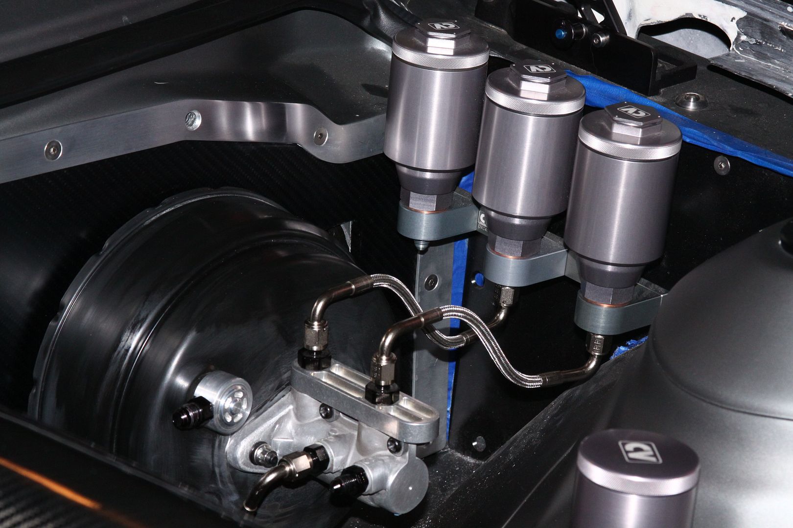 Speaking of details...... The plastic factory PS tank wasn't in keeping with the rest of the project so a CV kit was ordered. http://i1231.photobucket.com/albums/...ps07722170.png The kit brings two sets of bracket to giving different mounting options. Unfortunately neither of the two brackets worked with the fifth gen setup. So it was decided to mount the tank remotely. Unfortunately again the piece the tank mounts to was to short to mount it to the shock tower. So it had to be extended. My buddy at HM Racing and Design milled a piece to weld onto the CV piece. http://i1231.photobucket.com/albums/...psc1aa3681.jpg The two pieces were then welded together. The back side was given an angle cut to match the slope of the shock tower. Holes were drilled at the same angle as the shock tower so that the bolts would sit flush to the sheet metal. http://i1231.photobucket.com/albums/...psa2c57776.jpg Finally the boys smooth it out so it would like look like it came that way from CV. http://i1231.photobucket.com/albums/...psbc70ff99.jpg And finally the almost finished product.Still need to get anodized. http://i1231.photobucket.com/albums/...psd95220be.jpg Lot of work went into making something look so simple. What I covered was just the high lights. |