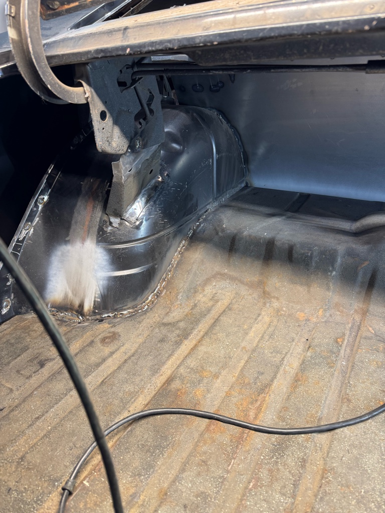 Before I welded it in, I put the seat belt bolt backers in place, and also cut the hole for the shifter. I also welded in thicker material under the shifter opening, so that I can put on a rubber boot.