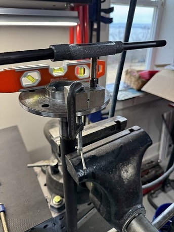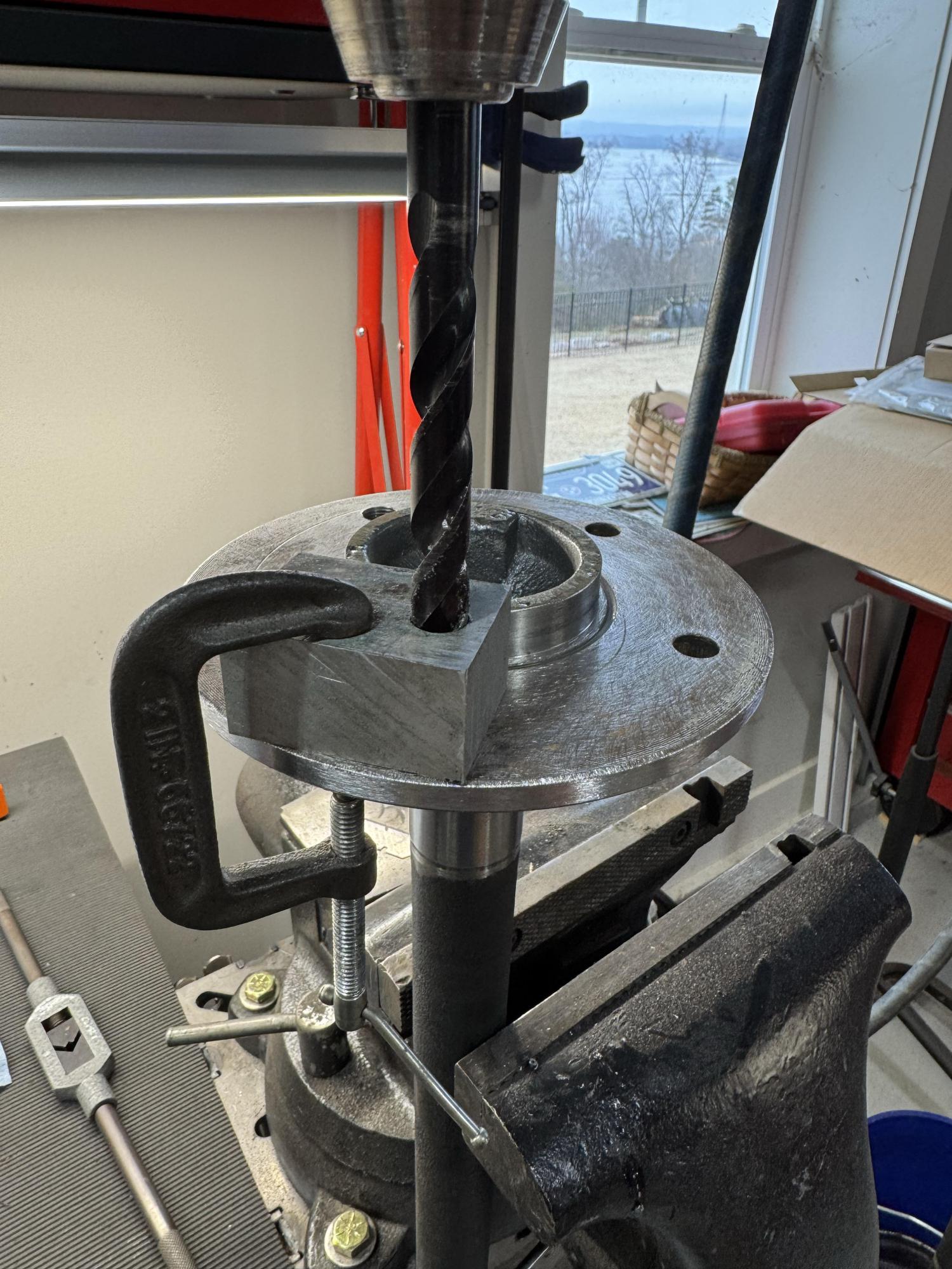Got the axles back from the machine shop and set up to drill and tap for new 12” studs. Made a block to ensure that the drill and tap went in straight. Attachment 83560