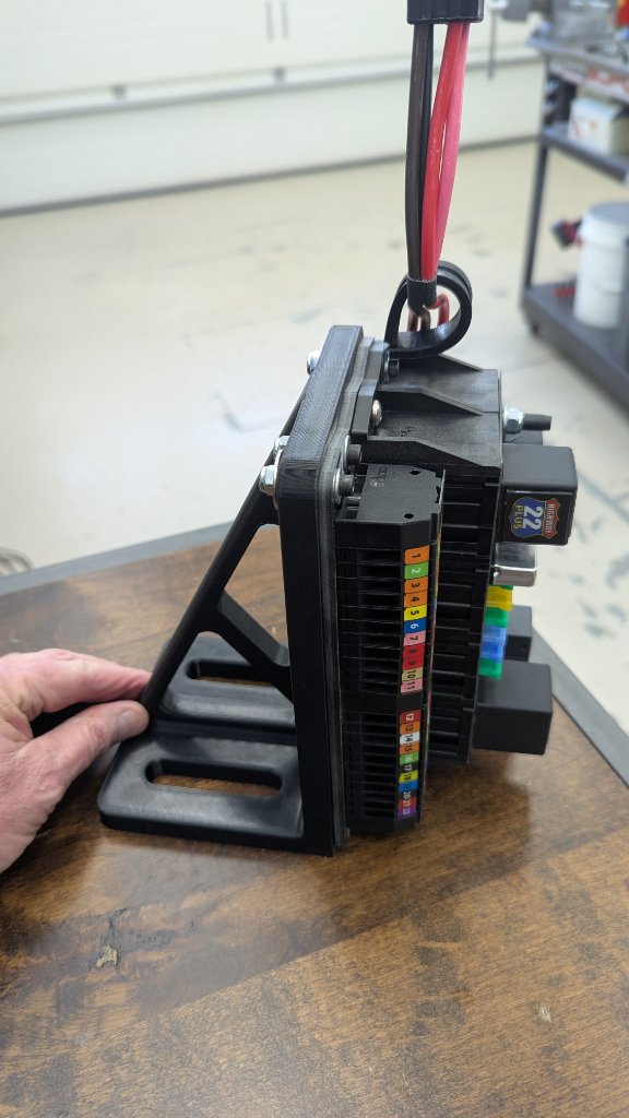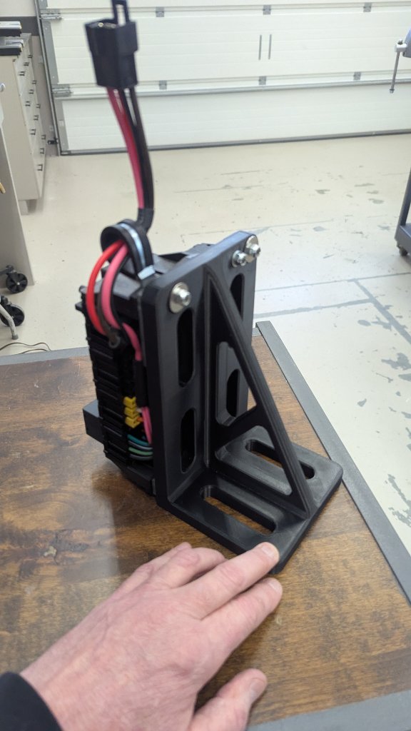 Will mount the fuse panel above the trans tunnel for easy access but need to mount it vertically to not interfere with the AC ducts. Printed this plastic bracket. ABS plastic and it's only 20% solid so it's light but I couldn't break it by hand. Made the areas with bolts 100% solid for added strength (not shown is I used threaded inserts that I melted into the holes and also used nylocks to ensure the fuse panel never came loose. Yep, sorta enamored with this 3D printer, certainly opens up options. I will make an access panel in the side plate for the center console, coming soon. Attachment 83855 Attachment 83856 |