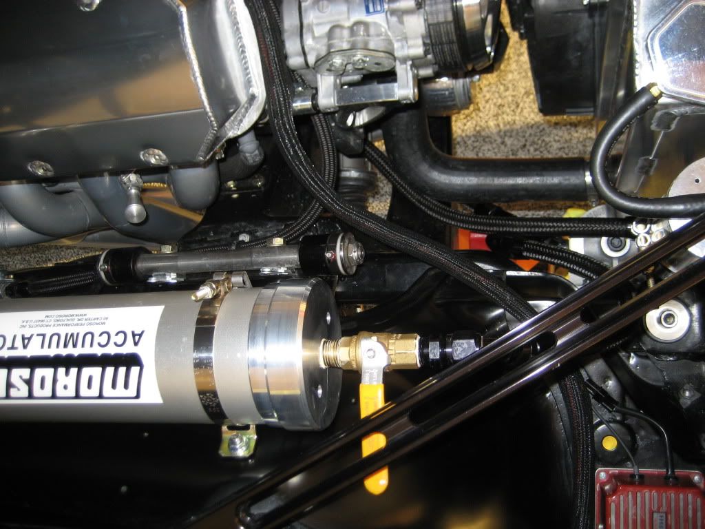 The road course thrash has been on all week. I won't run a road course without an accumulator. (Poor mans dry sump) An accumulator will provide up to 5 seconds of oil pressure if the oil pump pick up is uncovered in a high g corner. After watching video at spring mountain, I know they have many 3-5 second high g corners. The accumulator holds 3 quarts and has a piston that reacts instantly when I turn the valve on. I won't use it on the street. I'll have to turn the valve off while running to store the 3 quarts. I can also prime my engine by opening the valve before start up. Pretty cool piece. It's frickin huge though. I had no choice but to mount in on the inner fender. I like the race look of it.