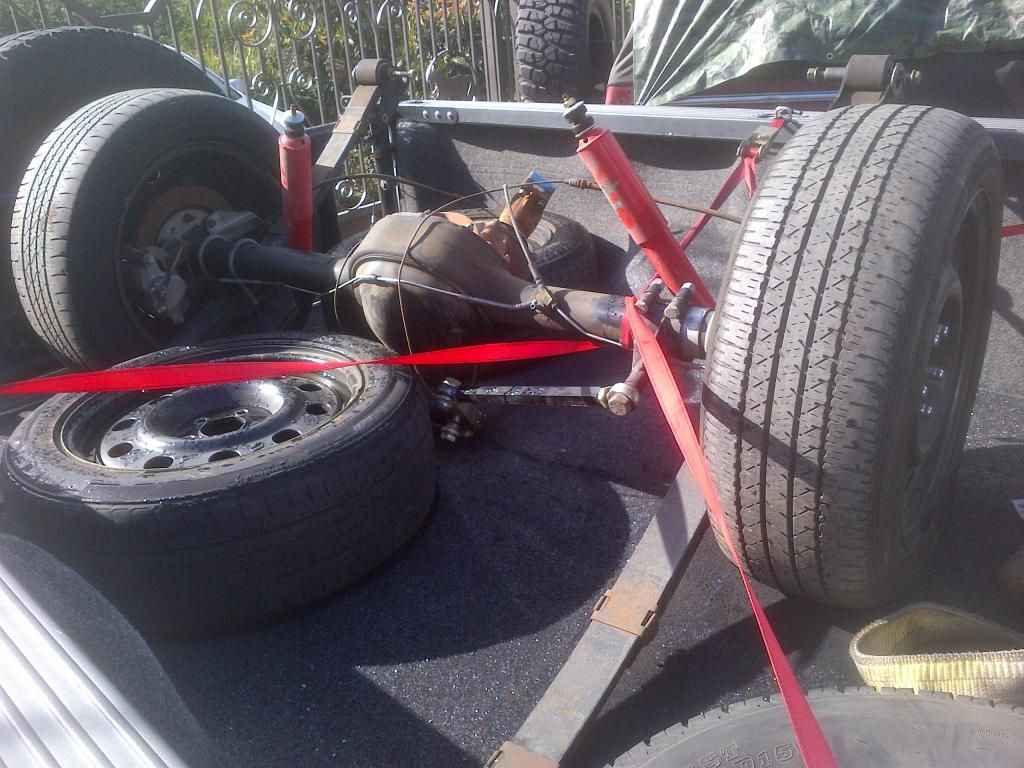 So we get there and the car is already on the ground and ready to load on the trailer. I'm playing it not acting too excited or anything. :omg: :drool: :drool: You know, no big deal to me just hanging out getting a car. Anyways the guys remind me stop staring an lend a hand loading my complete 9 inch housing, third member with Watts linkage, disc brakes and tires (what was in my car) in the back of the truck. WTF this thing is heavy and awkward even with four of us. I feel beat like I didn't get any sleep. Geeze... what's my problem that can't be it.:headscratch: The bed of this truck is only 39 or 40" off the ground this shouldn't be a big deal. Heave ho. http://i291.photobucket.com/albums/l...ps5baa43bd.jpg Al right that's done time to stare at the car again right. "hey Rob want to back the truck up" You see that is a guy with class trying to remind a half asleep dumbass like me 'UH we need to get to the show, can you help out a little and stare at your car after we are on our way'. I snap out of it (or I think so) and get in the truck to position the trailer. As I make like three attempt to line the trailer up to the car I realize I think I'm still asleep. Geeze I'm glad there is nothing to hit out here. WTF. Ok close enough for government work we can start loading. It appear I wasn't the only guy who missed a few things in the hast of trying to get on the road last minuet. :rolleyes: Wait for it you'll see what I mean soon. So Brett brought a small winch and bracket to bolt to the front of my trailer. At least he seems to be doing well with no sleep he gets that thing on trailer quick and is paying out the cable. (oh yea fat joke crowd it was only a 2000lb atv winch and it pulled the car up the trailer :mock: ) Jeremy has grabbed some axle straps and we are hooking the car up. Seems the car is kinda low. 3.5 or 4" to the lowest point with the skate board wheels. My trailer has a dovetail although short it should be ok. The car gets most the way up the trailer and all of a sudden the winch is laboring. (No the car isn't fat). Look under there somebody left a deep socket on the trans mount and it hangs down a couple inches and is now wedged between the car and trailer. How cool is that.:bang: Brett lets the car roll back a bit but that socket seems determined to go home with me now so out come the boards to go under the rear tires so we can clear the crest of the dovetail with the socket. A few minuets of back and forth and another set of boards and we get the socket past the crest in the trailer. Ping... clink... ding... WTF now it decides to just fall off. 2000+ mi in a trailer from IL; loading and unloading twice out of their rig; and now after we F around for another 20 min with these boards it just fall out? Hey Murphy thanks a bunch could you at least bring me one of your Irish Stouts while I suffer through this? :bang: :bang: Whatever it's on the trailer and Phil and Jeremy are helping us throw the straps on it. Did I remind you these guys, may be, better people than they are fabricators? Remember they had to get to the show to help out somebody else. They stuck around and made sure we were all set before they left. Class acts. Cool beans now Brett and I just need to park the trailer in this lot and lock it up and we can go to the show. Maybe |