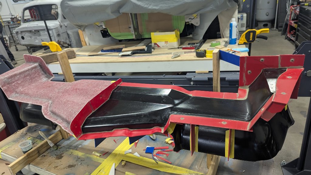 Masking tape so the hot glue doesn't permanently stick to anything. Use a lot of cripples so the plastic doesn't move or break off during laminating, last thing you need with wet 'glass! Attachment 85650 I welded in a fairly stout inner structure while the valence was still on the car. Given the weak-@ss nature of how the shape of the spoiler was created, can't have anything flexing once it comes off the car. Attachment 85651 Attachment 85652 Other side of the bumper mold laminated. Attachment 85653 |