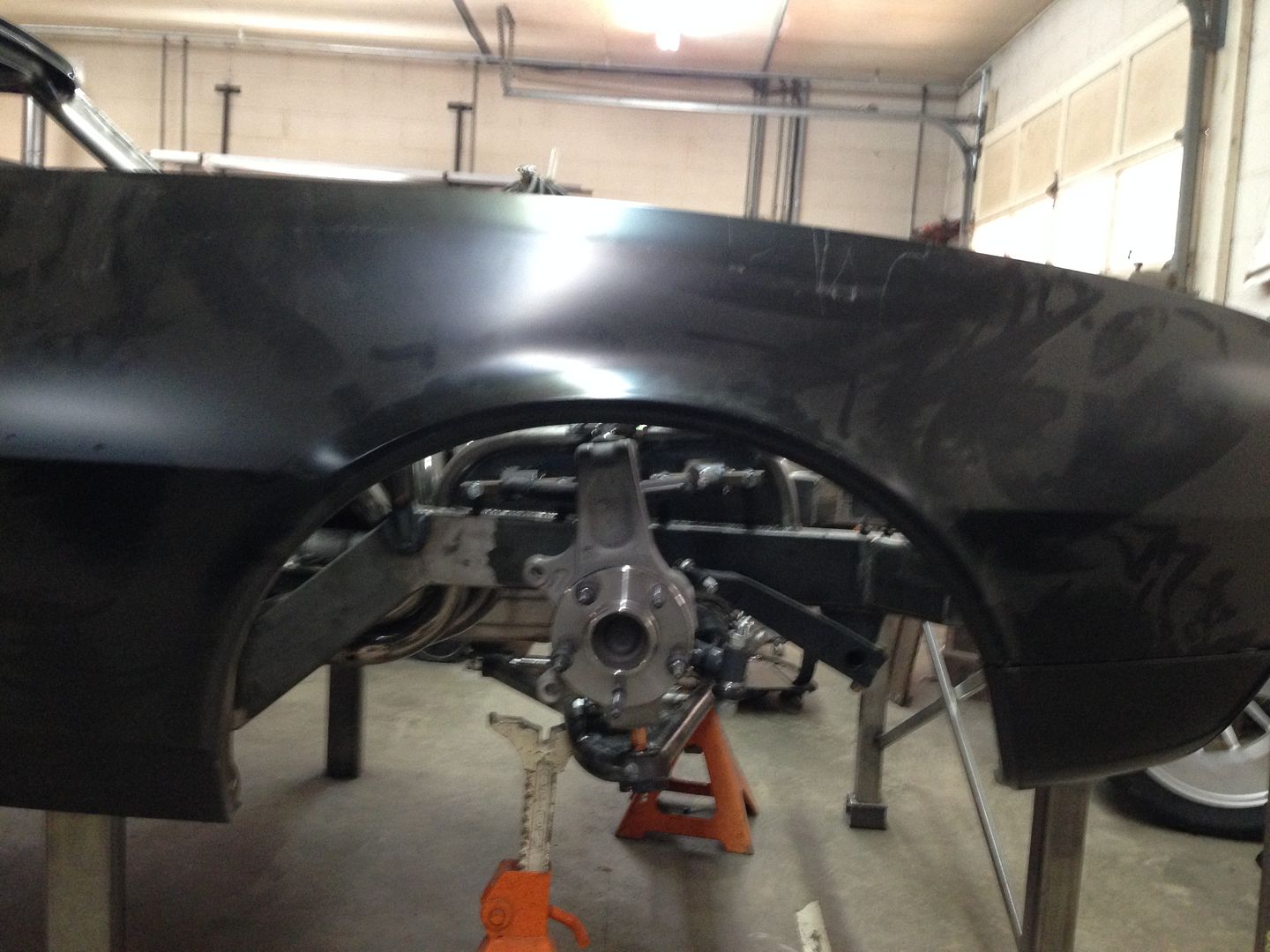 As low as this car sits, 4 inches at the frame at the firewall and 4.5 inches at frame in front of rear wheels, we were going to need to cut the front fenders. This is the first rough cut just so we can get the wheels on. I am going with Sutton's high travel low roll strategy and will be traveling the front wheel 3.75 inches.