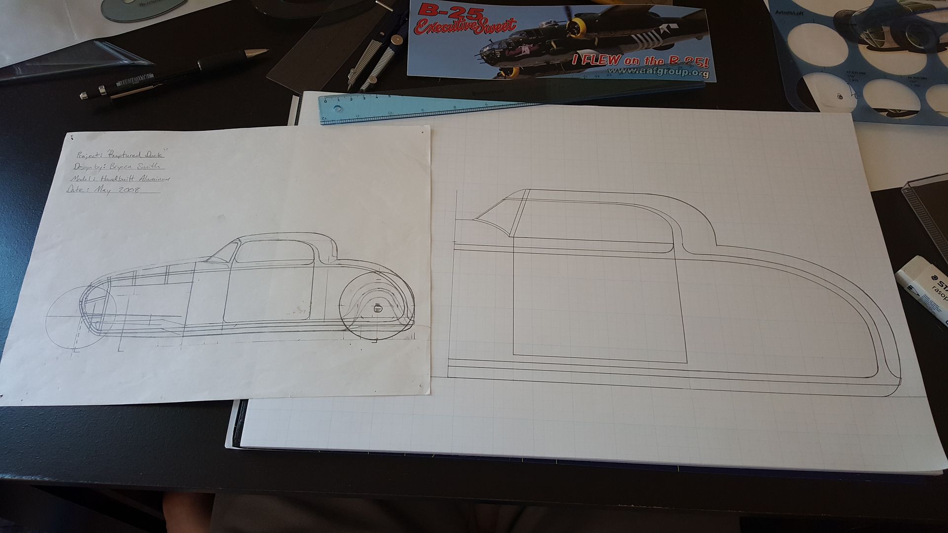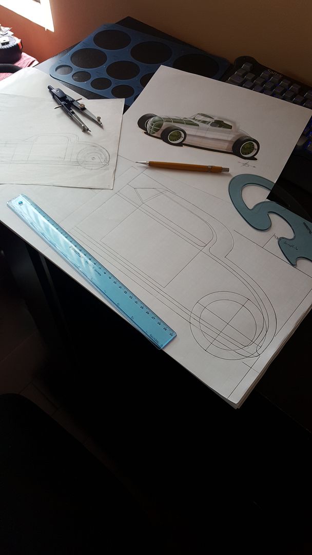 I have been locking down the final body shapes and lines and because of that I spent quite a while laying things out on paper in the form of scale drawings. Once I locked in the side profile I wanted, I then moved onto a direct front view. Once this was finished I had both views printed out in full scale and from there used them to cut out the start of the wooden buck. Here are the pictures. enjoy. http://i205.photobucket.com/albums/b...621_164545.jpg http://i205.photobucket.com/albums/b...629_184539.jpg http://i205.photobucket.com/albums/b...629_185345.jpg http://i205.photobucket.com/albums/b...627_193025.jpg http://i205.photobucket.com/albums/b...714_173329.jpg http://i205.photobucket.com/albums/b...714_175719.jpg |