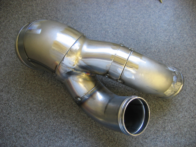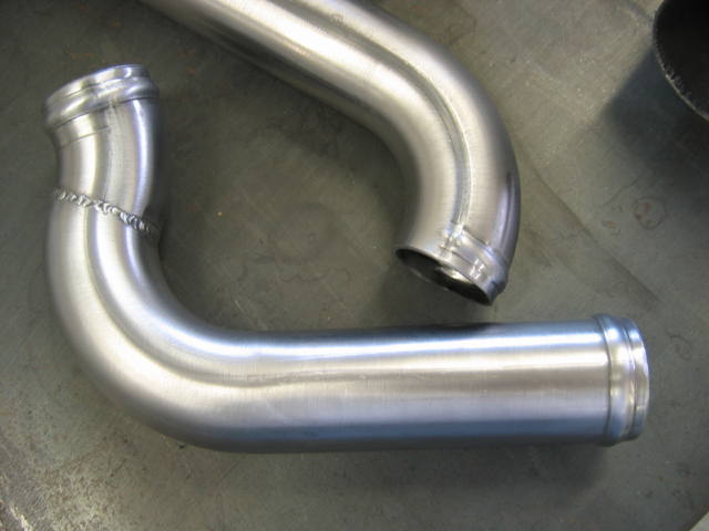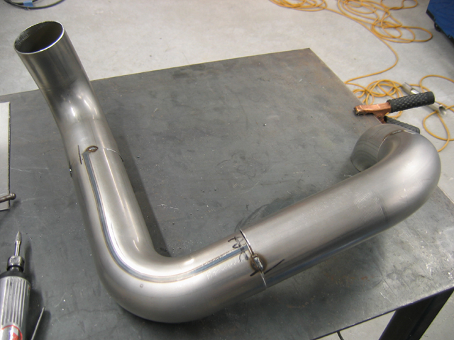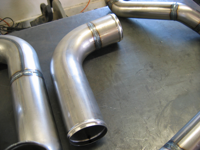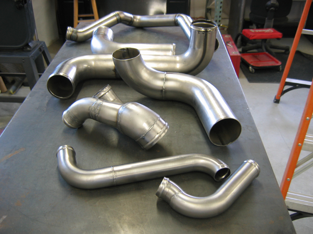 OK, just picked up the piping after it was finish welded by a friend of mine, Warren at Midnight Performance in Rancho Cordova. I do all my dynoing at his shop. I originally built these pieces with the intention of having them copied in single pieces, but the compound angle and short distances between bends wouldn't allow most of them to be done as a single piece. That meant welding up what I had; since I can't operate my tig worth a darn I opted to let him weld them up for me.