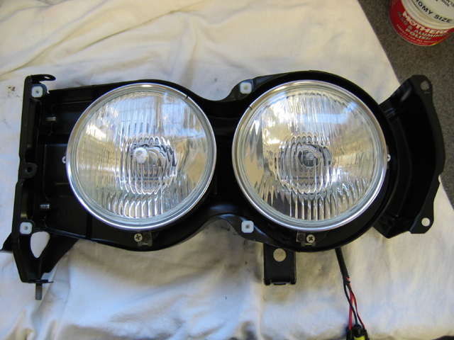 had my headlight frames powdercoated. Changed the halogen bulbs for true HID's, with HID low and high beam on the one bulb. I don't think I'll even plug in the normal inside high beam as it won't match and the two outside lights will be plenty.