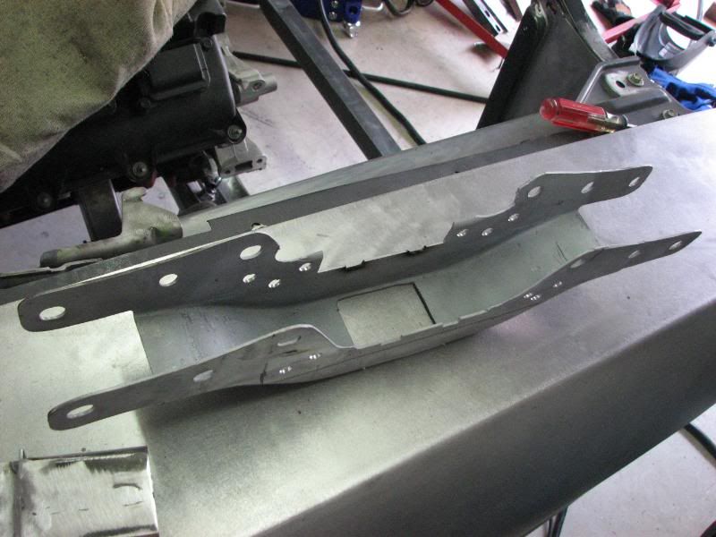 Finnished up with my transmission crossmember. I messed with a couple of ideas but finally decided to just start off with the stock one and modify that. I hollowed out the center section and then made a new piece that slides inside the original "housing". It worked out pretty well. I got the tail of the tran up at a decent angle and left the crossmember tacked togther in case I want to mess with it some more.