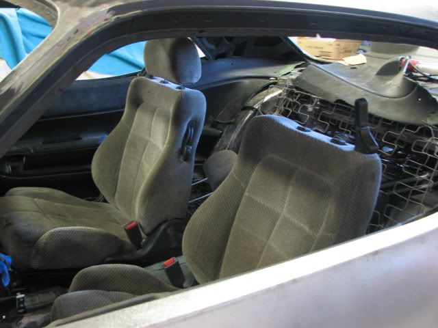 Seats.... I went back and forth on seats for quite a while. Aftermarket vs junkyard. I love the Sparco, Corbeau, Recaro etc, but they are kinda pricey and I would end up recovering them anyway, so I decided to do the junkyard route. Looked at a ton of cars and finally found some seats I liked. They came out of a 98 Dodge Stealth. The are pretty comfortable and have alot of adjustment too. The were kinda of a PITA to mount....... the slider to the tunnel side was 1.5 inches higher than the outide one and my floor is just the opposite. I managed to figure out a way to mount them, but it aint the prettiest piece when you take a close look. I plan to do some stuff to hide the tunnel side mounts.