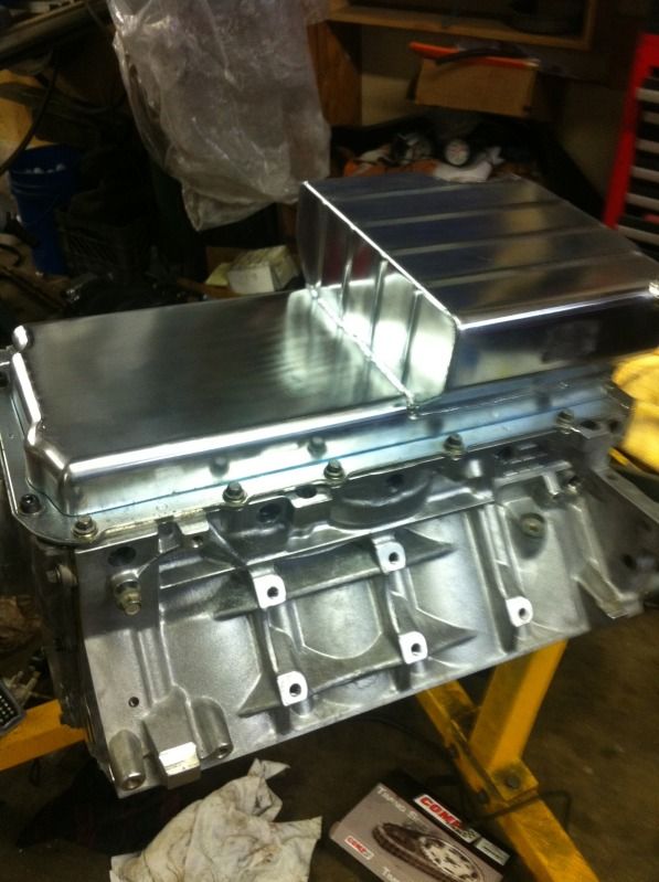 Here's some shots of the new HKE 383 bottom end getting my old ET 215 heads, Fast 90/90 top end, Autokraft oil pan going on as well as the new Katech valve covers.