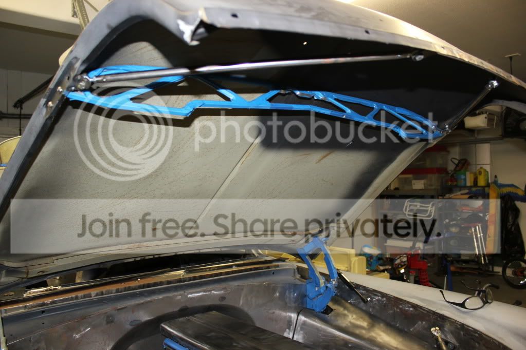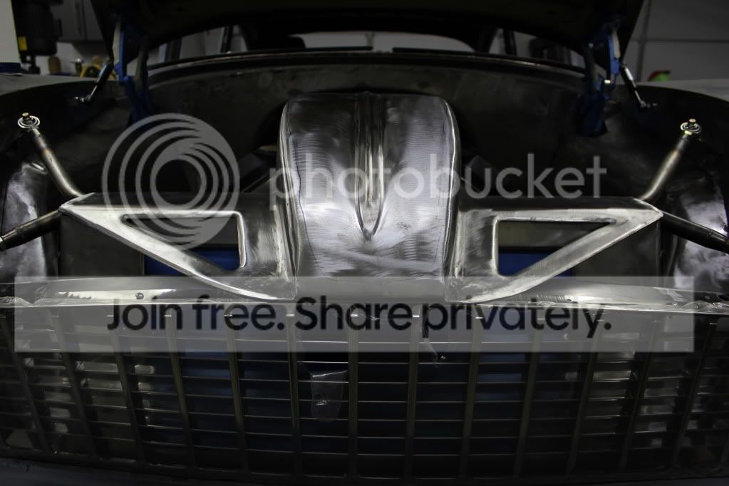 Here is a shot of the grill support I had to make. I ended making about 1.25" wider than the factory one. Without the factory latch and support in the middle the original one was a little flimsy. This area in the middle is extremely tight now with everything I had to compact in there, not to mention I lost the area for the latch. Probably overkill but I made it out of 16 gauge. It is plenty stout now. Plus about 8" in on each side I ran a bar down to the frame for additional support. With no room for the latch I decided to use hood pins, although I didn't want anything seen outside. You will also notice the 5/8" holes in the support about 4" in on each side. The pins themselves will mount on the hood, go through the support and I will pin them through the grill opening. I'm starting to work on mounting the pins now. http://i591.photobucket.com/albums/s...ps7dbb1936.jpg With the air intake there was no way the factory hood support would work - not to mention they are a little ugly IMO. Fortunately I was also able to use the hood support that EMS makes. It clears the air intake by about 3/8". Got lucky! Very nice piece. I'm suprised it took this long for somebody to step up and make one. For the forward support bars I ended making a bracket for the hood and used tubing with LH & RH rod ends. http://i591.photobucket.com/albums/s...ps9ff76110.jpg http://i591.photobucket.com/albums/s...ps490a6374.jpg |