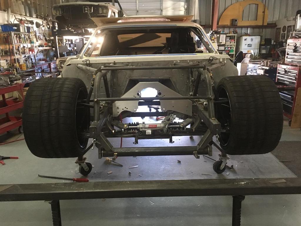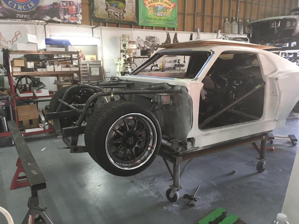 Good eye Lance! This is a "Zero Scrub" car. So it cuts like a mutha in the tight corners. The chassis & suspension will get powder coated ... and the body sanded & wrapped ... after our June 28th track test. Then all put back together to run the NorCal Shelby Club Mini Nats August 3-5. |