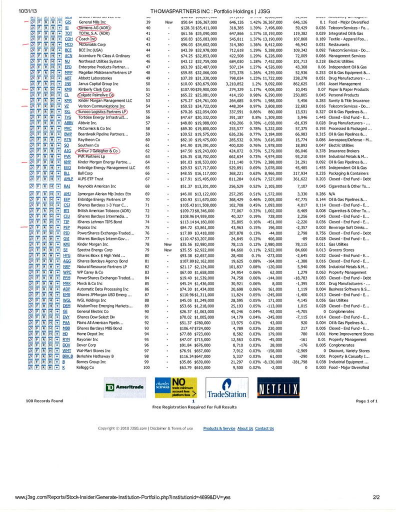 My fellow Schwab-ers have probably seen that they're really pushing their "ThomasPartners" dividend growth strategy lately. It's a portfolio of only stocks with a strong dividend history. Thanks to the SEC, portfolios are public information...so I wanted to take a peek into what they are holding so I can start doing research for my 2014 purchases.