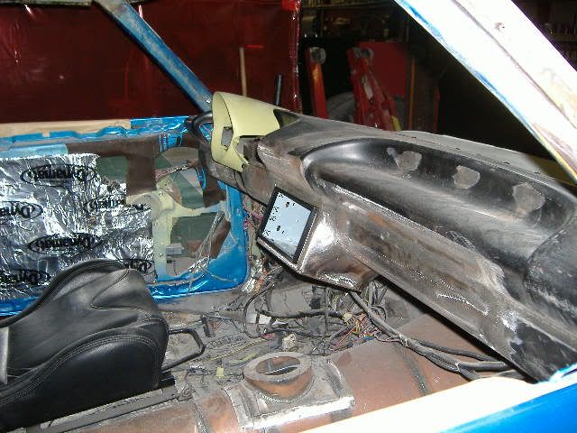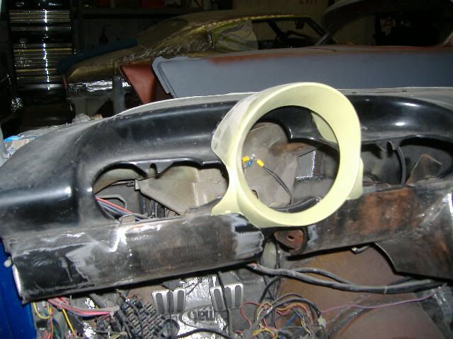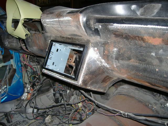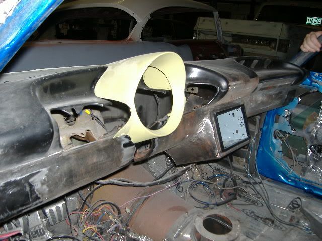 Well, as we all like to say..."not much of an update," but here it goes anyway. Getting ready to get started back on the body to take any small dings and deep scratches out. Got the '59 Impala dash tacked in. All the knob holes, glove box and stuff have been deleted and shaved and it has been fabbed for my double-din radio. You can also see where it has been notched out so you can read the vin#. Also shaved the rear quarter, marker lights too. Like I said, not much to see...so that's all for know.