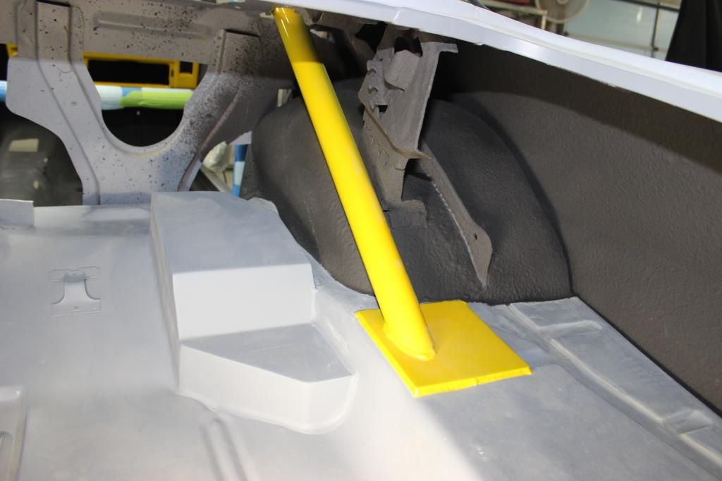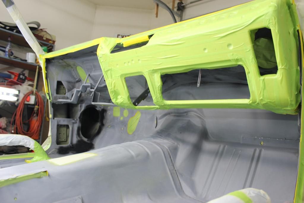 One of the things that I have been able to figure out is that I need to be spraying the white sealer over the gray primer before spraying the velocity yellow. The yellow does not cover real well. So far being able to spray the bottom and then the firewall has sharpened up my skills, after twenty four years they have gotten a little rusty, but it's coming back. I went ahead and cut and buffed the firewall as a good spot for the practice for the rest of the car. |