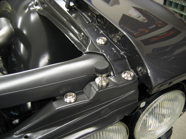 got my front support panel back from the painter (thanks Jim!!!) so now the front end can be finished. Added some Marquez Design hood stops (these are very nice!), finished off most of my Ring Bros. bolts, and fitted the front grille and trim. Only thing left is the bumper, and I'll need a helper for that.