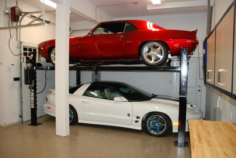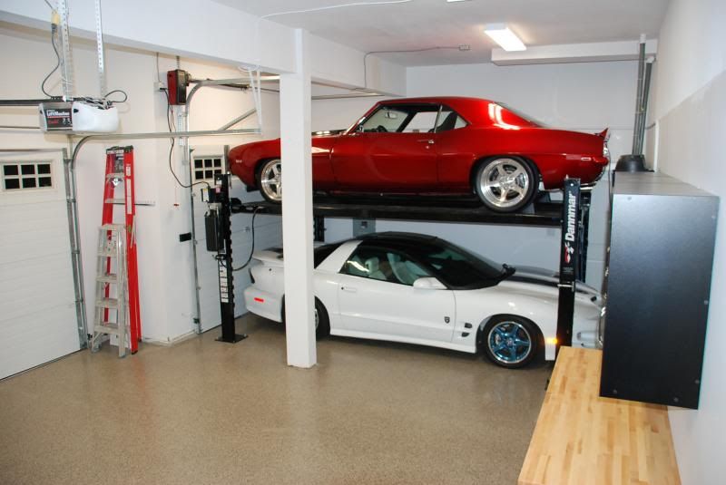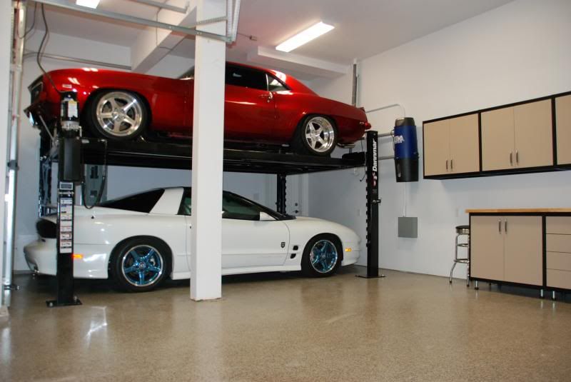 Guys sorry have not been on the site alot lately I've been busy with many things and not much time to be on the site. This is one project I've been working on. I may start a thread on it. But it's the garage project at my new house. I ended doing a garage floor coating, garage cabinets and a 4-post lift. There was alot of legwork and other things that had to be done to make it all work and fit but it's finally done. And now I can let u guys know that I welcomed home my other car I'd been storing at my buddies house. It's a 99 30th Anniversary Trans Am, Ive always liked them and found this one. I've already done a host of mods including CNC 243 heads, EPS 222/226 Cam, Kooks LT Headers and True Dual exhaust, LS6 intake, TB, Full suspension, new brakes and clutch. etc etc. It made 425 rwhp and 412 rwtq on the same Mustang dyno my 69 was recently on. Anyways, on to the pics of my SW inspired garage :D