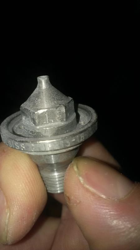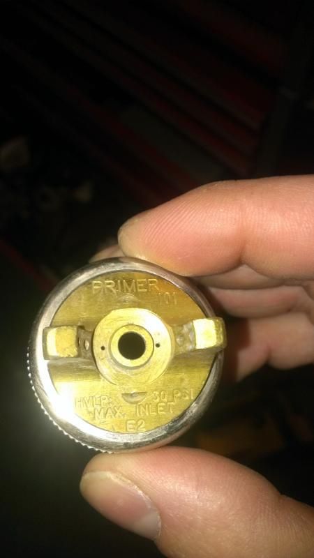 http://i9.photobucket.com/albums/a56...psfb9886e4.jpg and this primer nozzle http://i9.photobucket.com/albums/a56...ps935c0c00.jpg on a 670s devilbiss and it spray perfectly. Check what size you use. Also, check the packing in your gun and check if the nozzle had a blocked hole |