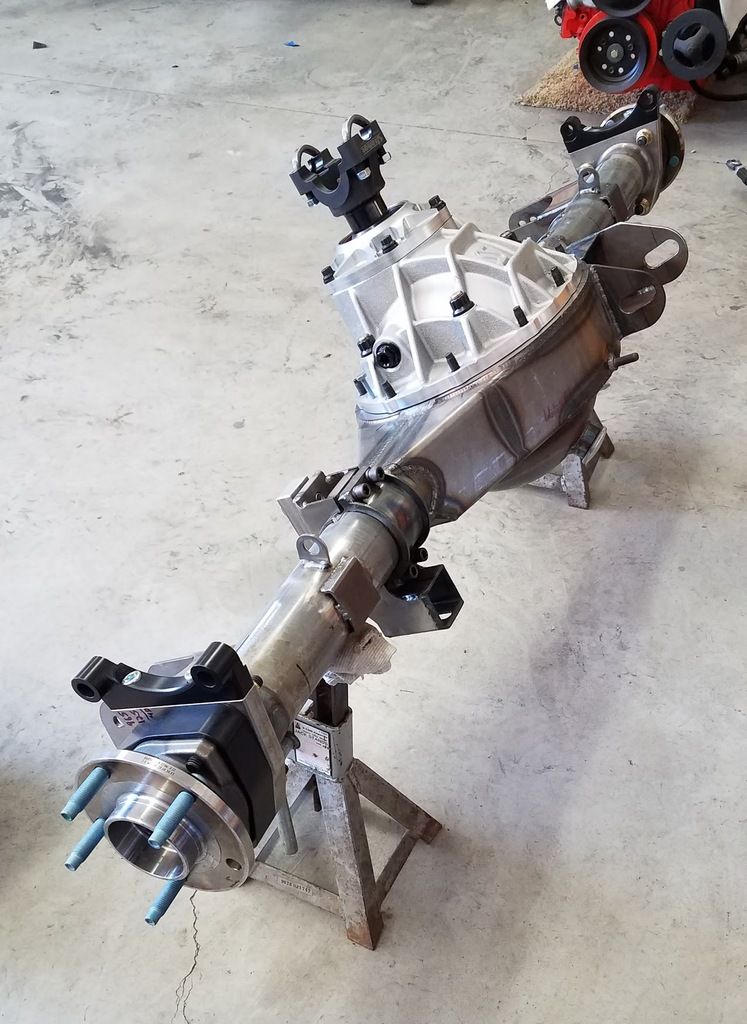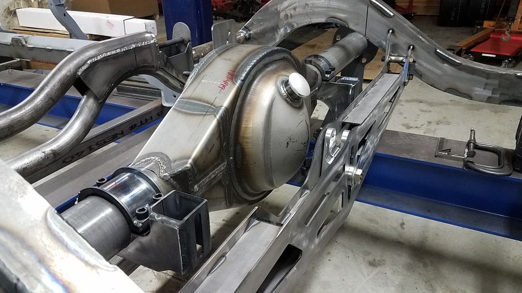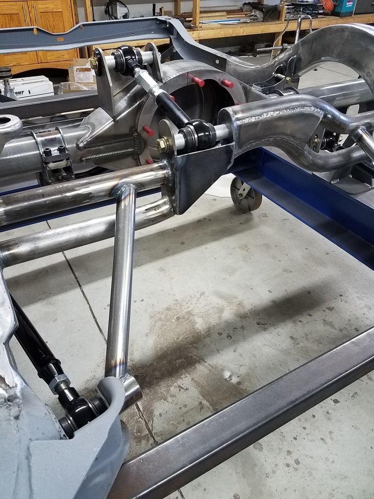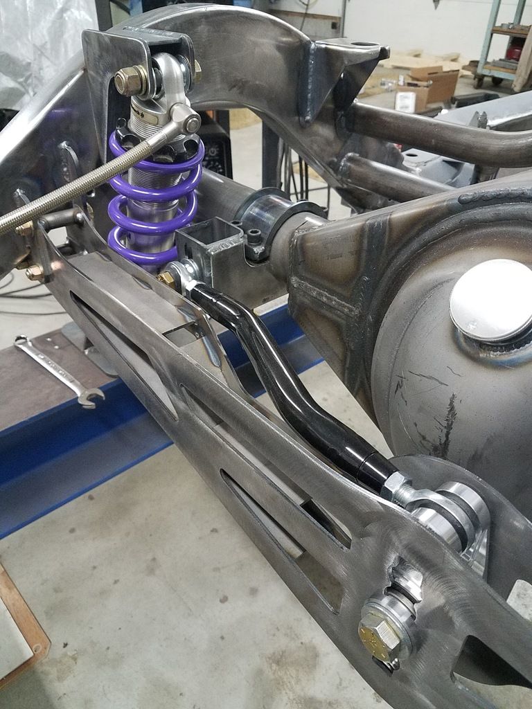 What I came up with was a 3-link to replace the factory tri-angulated 4-link with the addition of a Watt's link. It almost packages completely under the stock floor/trunk pan...I say almost because the upper 3rd link bracket needs a clearance area in the trunk "shelf" above the axle. I jigged up the frame to a frame cart, setting it at ride height and tacking it down. After everything was squared up and true, I cut out the kick-up area over the axle. I drew up and had new frame rails laser cut out. They also utilize internal gusseting with tab-in-slot construction. They are really stout. Here's the rear rail section during fab. http://i1207.photobucket.com/albums/...psbmlcio0h.jpg I originally had planned on a factory style tri-angulated 4-link with a Watts. But upon finding the CAD model going into bind with the addition of the Watts, and then confirming it with a few guys that actually had a Watts with a 4-link, I decided to go to the 3. Glad I did in hindsight, look for the link to the video below! Ok here is the 3-link during fab/mock up (I know, the welds suck on the crossmber side plates...it was the very first thing I ever tig welded, I got better, honest!): http://i1207.photobucket.com/albums/...pss0iqylyq.jpg http://i1207.photobucket.com/albums/...psp4yyd9wt.jpg Once the axle was hung, I moved on to the Watts link, or Oberlink as it's been called. I wanted a chassis mounted bellcrank that packaged well, so this is what I came up with. It has rc adjustment from 7.5-12.5". Pcs to build it (thanks UMI!): http://i1207.photobucket.com/albums/...psb9sings1.png Bell crank assembly, built by myself: http://i1207.photobucket.com/albums/...psiqzjyhlk.jpg Assembly: http://i1207.photobucket.com/albums/...psnz3qg6ki.jpg The last big part of the rear is the Strange housing and center section, a Pro HD aluminum case with a Detroit Locker and 3.70 gears, DSE C7 bearings and C6 brake brackets. http://i1207.photobucket.com/albums/...psfofu12vu.jpg Mounted up: http://i1207.photobucket.com/albums/...psdvtnlgpv.jpg http://i1207.photobucket.com/albums/...pshhga2sj5.jpg And now, the cool part seeing it in action! Next post I'll show some of the other parts that were custom made. |