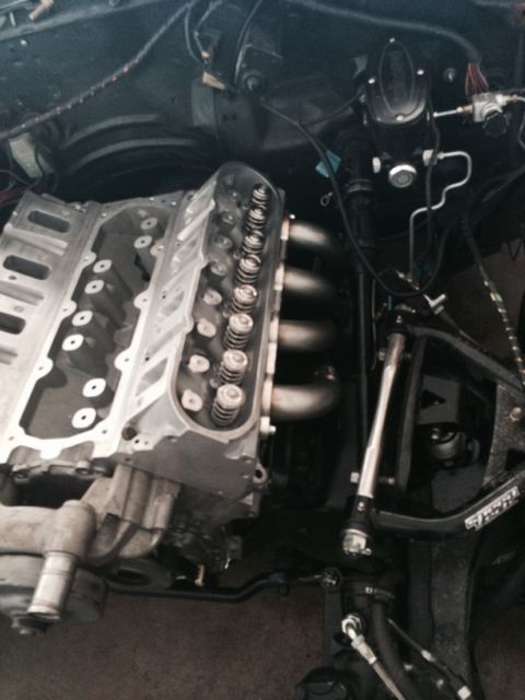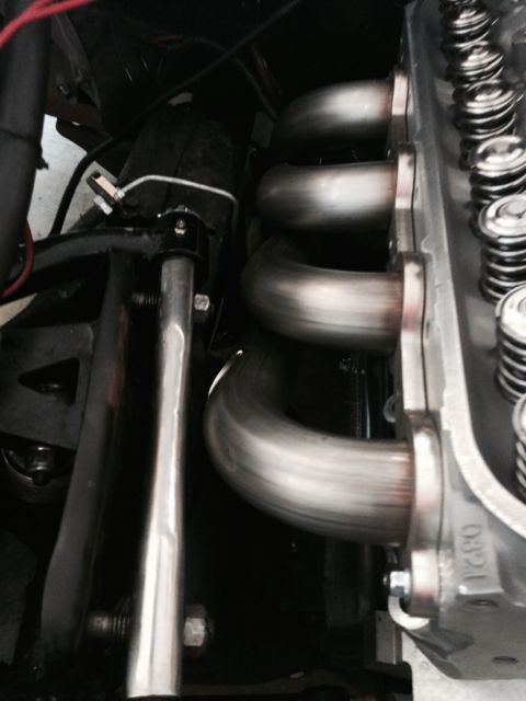 Finally think I have most of my parts for the new engine. Head arrived over the weekend and look very nice. I mocked the engine in place and am very happy with the placement of the engine and the header fitment. Everything is tucked up nicely. Even with 1/2 height body mounts I have ~1/2" between the collector and the floor pan. The pics aren't that good because it was loosely mocked up. Once I have it all together I'll take better pics.