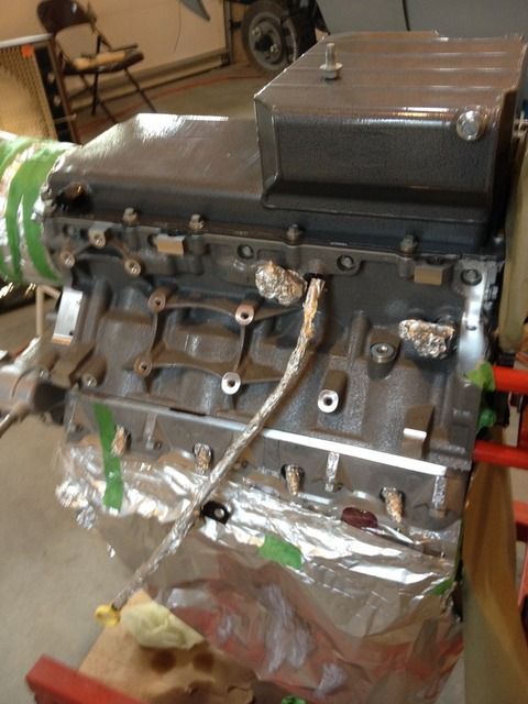 Spent the day out in the garage today. Swapped out the AutoKraft oil pan and dip stick, then I washed down the motor and sprayed it with Eastwood's 2K High temp ceramic gloss clear. I'm no painter by any stretch of the word but I'll tell you it came out nice! The nozzle was great, nice fan pattern and it worked great. I also cleared my Street & Performance LS swap adapters. They look great.