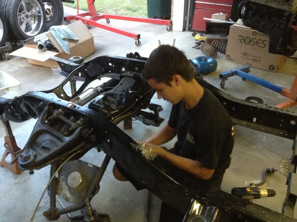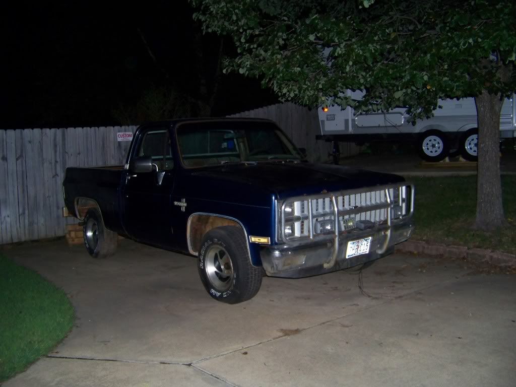 Anyway, here is what he bought for $250 of his own money the summer he turned 13.: http://i266.photobucket.com/albums/i...s/100_0132.jpg http://i266.photobucket.com/albums/i...s/100_1725.jpg and he got this one as part of the package: http://i266.photobucket.com/albums/i...s/100_0124.jpg We started on the blue one and gave it a wash before brining it home for a full inspection. We decided to take it completly apart and redo everything. From a distance it did not look to bad. http://i266.photobucket.com/albums/i...s/100_1724.jpg Did not run so we pulled the motor out to find out what was wrong. We found a broken flex plate, damaged harmonic balancer and a locked up bottom end. It was a 305 so off to the scrapper it went. http://i266.photobucket.com/albums/i...Bodies/103.jpg Fast forward about a year and we had this: http://i266.photobucket.com/albums/i...1/363a5a1e.jpg by this time we had modified the frame for the rear notch and raised the front crossmember up in the frame 1.5" to get the lower arms up off the ground. We added dropped spindles and 13" corvette brakes to the front and did a flip kit in the rear. The cab had a ton of rust in it and we decided to use 2008 Silverado seats, so I built a custom floor to get the seats how we wanted and to clear the 4L60e trans. The engine is a 5.3 out of a 2000 GMC 1500 and we set it back as far as we could to help with handling. Korbin wants it to handle and stop well so that we can Autocross it from time to time. Up to this point we have done all the work ourselves either in the yard/garage at home, or is a shop I had rented for another venture that did not work out. While at the shop we did most of the metal work on the cab and got the Rack & Pinion steering set up in the frame and put the frame back together. http://i266.photobucket.com/albums/i...DC5C7748F5.jpg |
