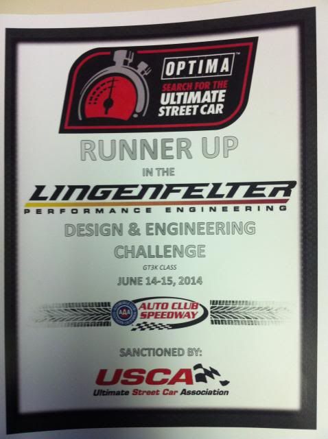 So all went well. The only issues we had were a too soft rear sway bar, and one of our BFG Rival tires decided to start coming apart. Our autocross and Speed Stop results weren't what they could have been, but that's what we had for the course that day. The Roadcourse was a lot of fun, and I feel we placed about where we should have. It was an honor to place second in the design and Engineering Portion, which was judged by Steve Rupp, Cam Douglas (optima), Lingenfelter Honcho, someone from K&N, and Larry Calehan from Pro-touring.