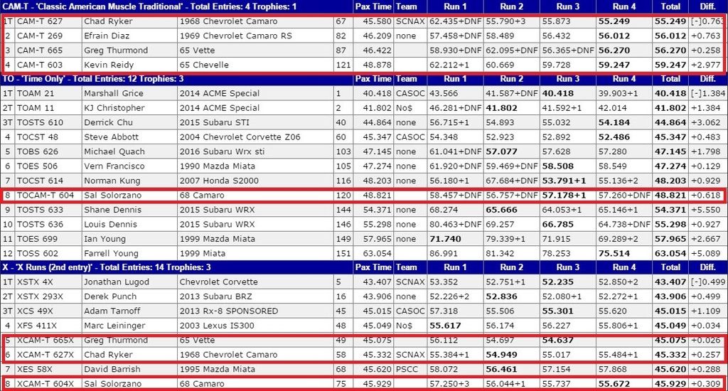 Greg even chanced driving Scar in the rain to come out. As he told me himself, it isn't a trailer queen! Efrain came out in his sweet yellow 69. Sal came out to get some payback on me in his twin red 68 Camaro and Kevin was there in his Chevelle. https://scontent-lax3-1.cdninstagram...67160627_n.jpg Scar is one sweet machine. The pain on it is beautiful and it was getting a ton of attention from the rest of the SCCA autocrossers! It was a great day. Three of us bought x-runs and so we got 8 runs on a super long and fast course, worked our session and were in and out in just over 4 hours and it cost me $55 (I have an SCCA membership). I love all kinds of performance driving but SCCA autocrosses are quickly becoming one of my favorites. Greg took some time to figure out the course but by the time he got into the x-runs he was laying down some sweet times and had the fastest time of the 5 of us. Here are the results: http://i1380.photobucket.com/albums/...psnqwwgn6h.jpg My consolation prize was that with Greg initially getting lost on the course I took the "win" in the points runs :) Here is video of this awesome course. ignore the out of sync g-meter. I bought my 2016 points card to make a run at CAM T. Who is gonna help make it a competition?? |