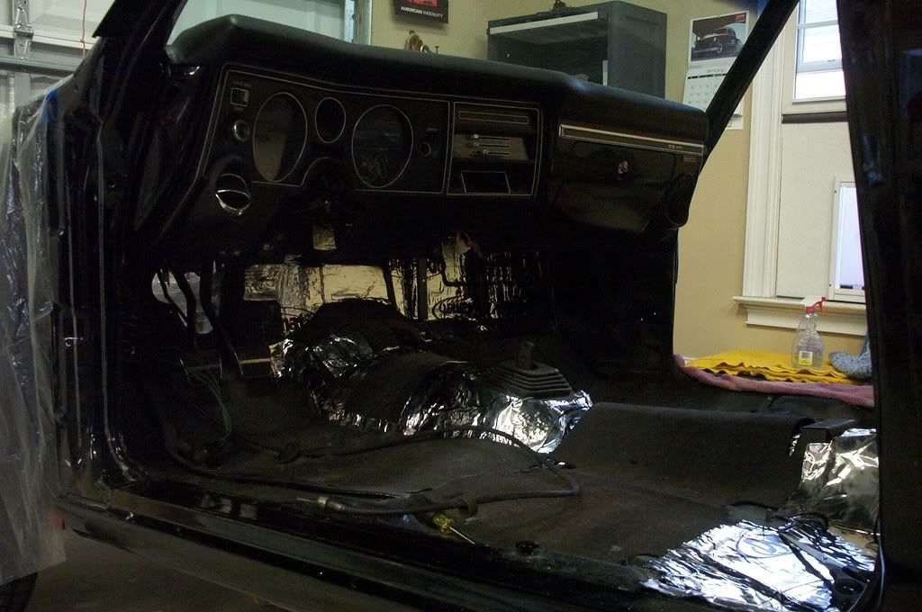 After getting the car back on frame I spent some time on the interior getting some initial wiring done and laying the sound proofing. The shot right below is simple sound proofing that almost everyone is doing. I ran it all the way up the front pannel as I had already removed the factory sound proofing to put in inner brackets for the heating unit and ignition box. http://i225.photobucket.com/albums/d...blk69ss115.jpg