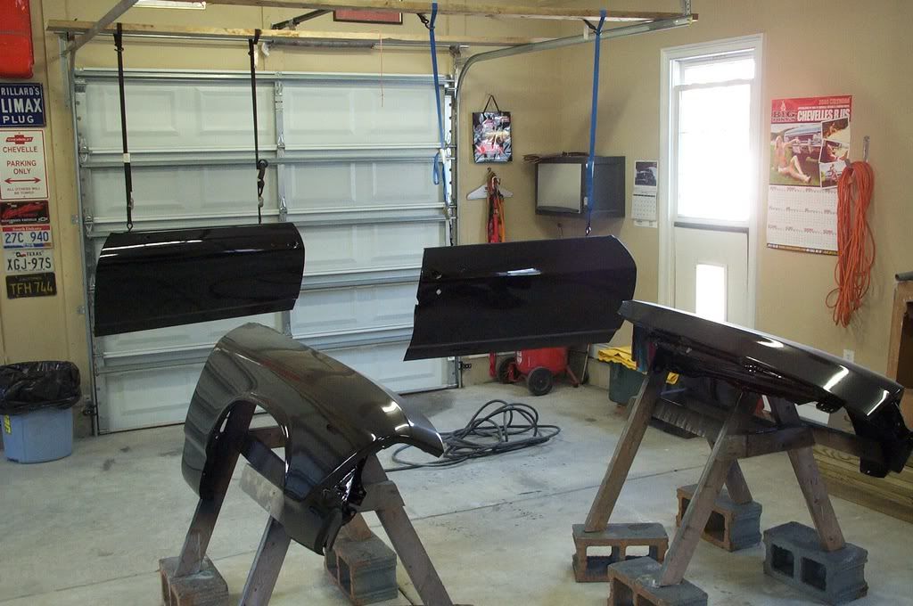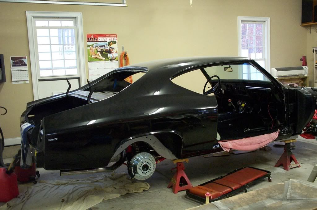 The wiring was a learning experience. Trying to keep wires hidden and removing the old remote sensing/regulator and moving the battery soleniod to the trunk made things fun. Add in the ignition box, electric fan, new headlights, wiper motor and new heating unit I had several electrical gremlins to work out. I was able to get it to fire after a couple of goofy mistakes on my part. You'll see the stainless steel headers turned a golden brown; I plan to remov the headers and have them ceramic coated along with part of the exhaust http://i225.photobucket.com/albums/d...blk69ss139.jpg Another step prior to the fenders was to get the brake system working. I decided to go with manual brakes to get as clean of an engine bay as I could. My wife and I pumped for ever to bench bleed it and I used all of my husband points as my wife was the pedal pumper overall. As a side note the paint appeared to turn out fine and had a good shine after the first round of buffing (my second paint job overall) . http://i225.photobucket.com/albums/d...blk69ss140.jpg I then moved the main car two the detached garage to have more of a 'clean' room (I took the wife's bay/spot) after a little begging. This allowed me to get the fenders and doors painted. http://i225.photobucket.com/albums/d...blk69ss160.jpg |