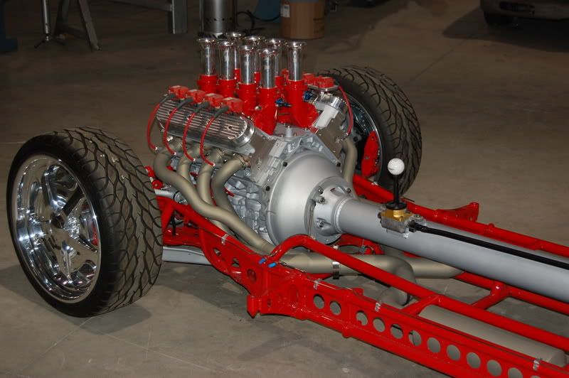 Since the kit was designed I picked up a 5.4L supercharged motor and trans out of a Ford Lightning. It's not in the car yet, but it's cold outside so I can't drive it anyway. Like I said, at 5500lbs, it'll never out handle a Vette; but top down cruising is a nice respite from driving all Bret's cars. http://ridetech.com/photos/13630T.jpg |