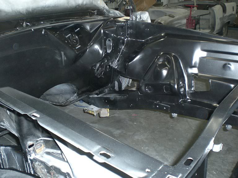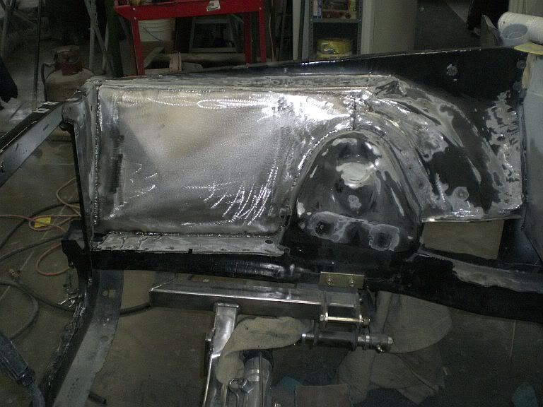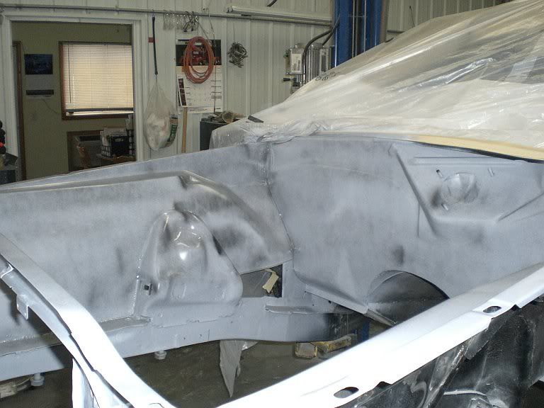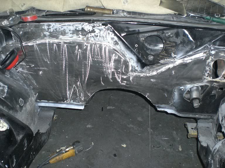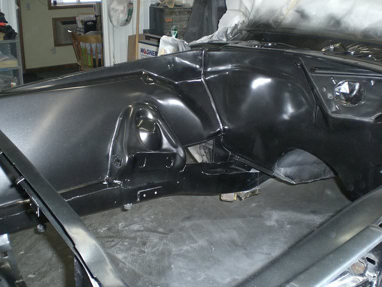 well not much time left to get it done for the power tour but I'll take it even if its in primer, with all the customer projects and this depressing winter it's been a slow moving project but I made some good progress this week making the trans tunnel and smoothing out the engine compartment, I hope by next weekend I'll have the underside bedlined and the engine compartment painted so I can start putting this thing back together. Here's a couple pics maybe some more next week.