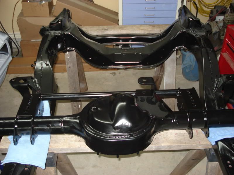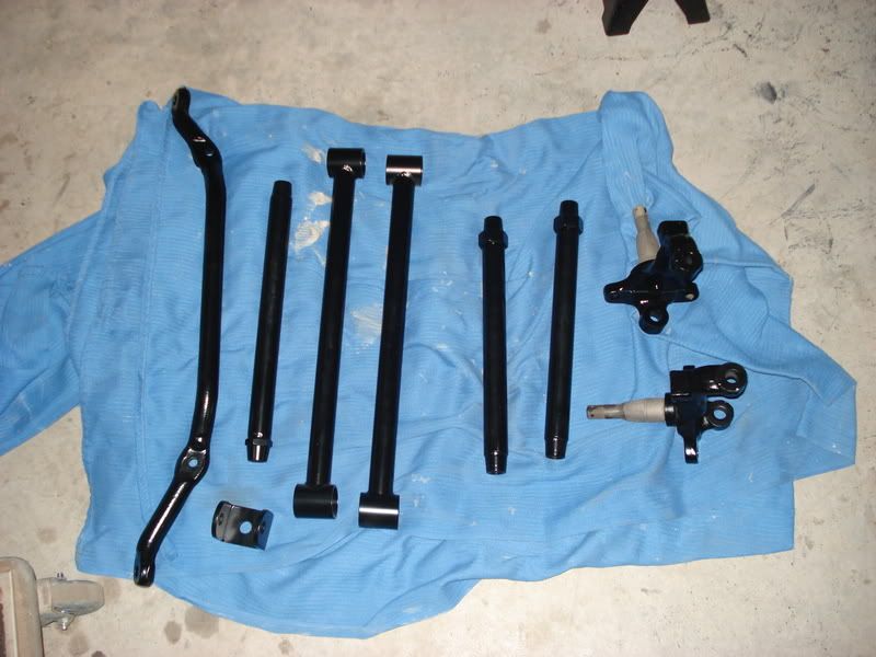 Well I just got my rearend, subframe, 4 link bars, spindles, and center link back from the powder coaters. I am very impressed with the quality, I really like it since it was free. I am also finished seam sealing the interior floorpans. I will probably start assembling the front end and spray the interior floors with the Raptor liner at the start of next week. Here are some pics sorry the new coated parts are still dusty. I went with a semi gloss black.