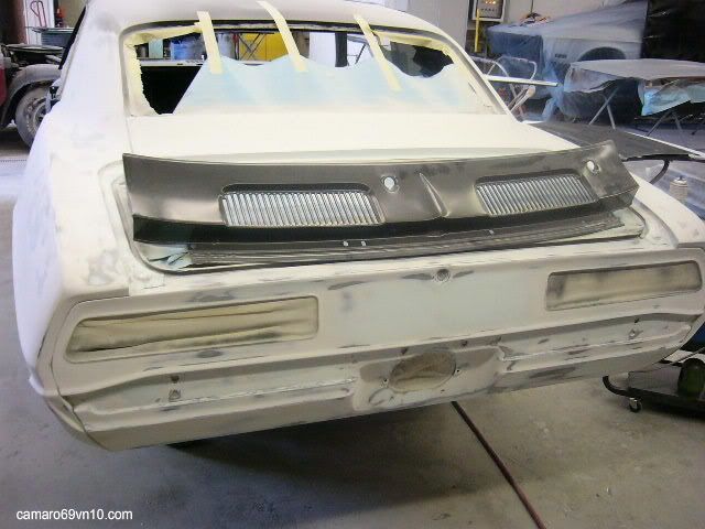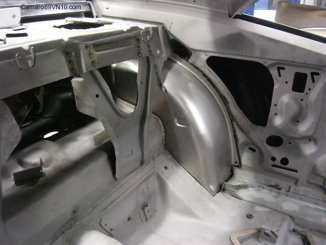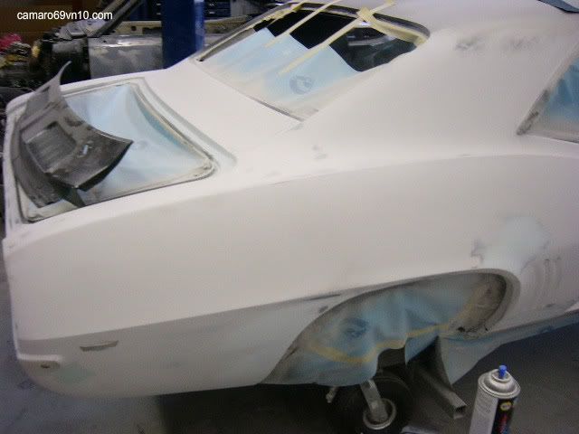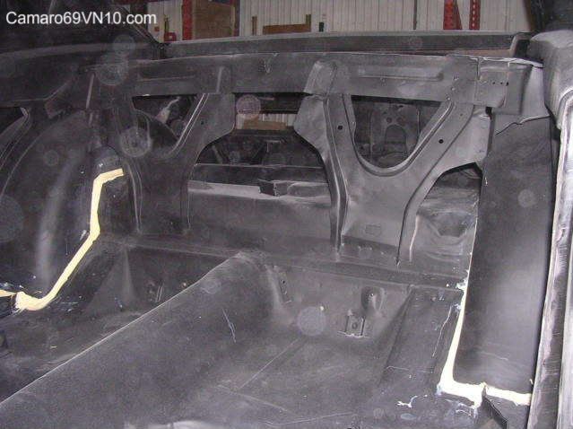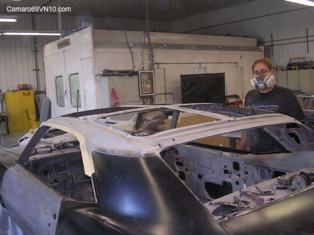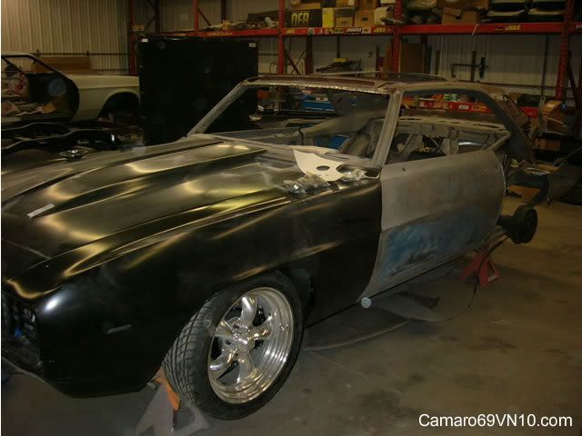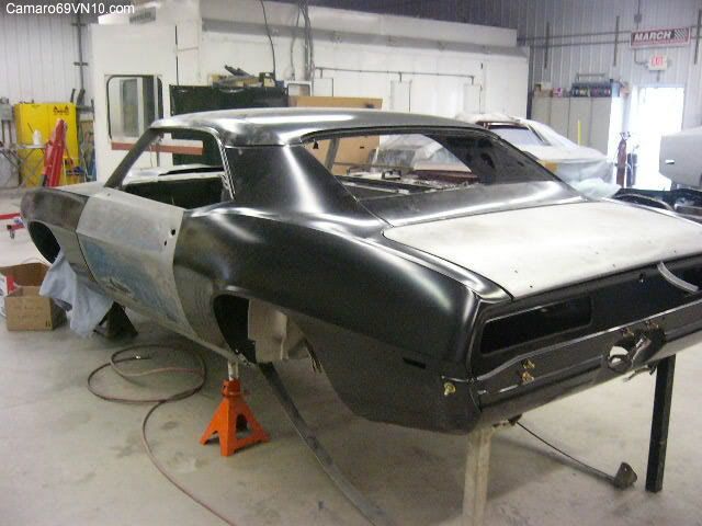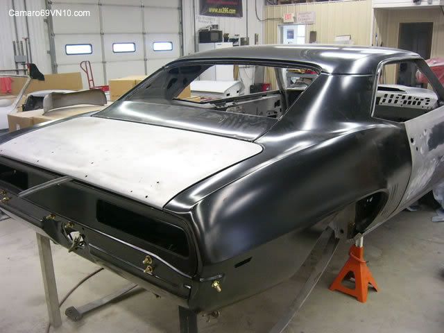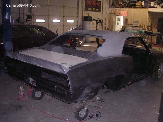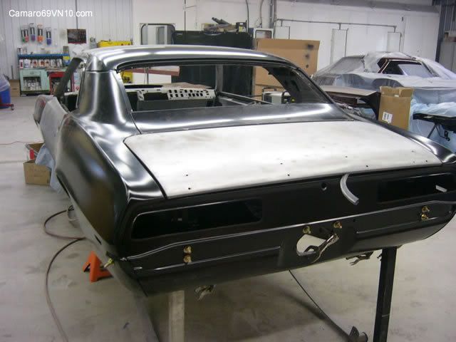 I stopped by the body shop today to take a few pictures and get an update. The DSE mini tubs, inner fender wheels, full rear quarters, rear window to trunk panel, and roof skin have been partially installed. Now comes the tedious part of adjusting, pounding and fitting the new sheetmetal to get everything to align properly.