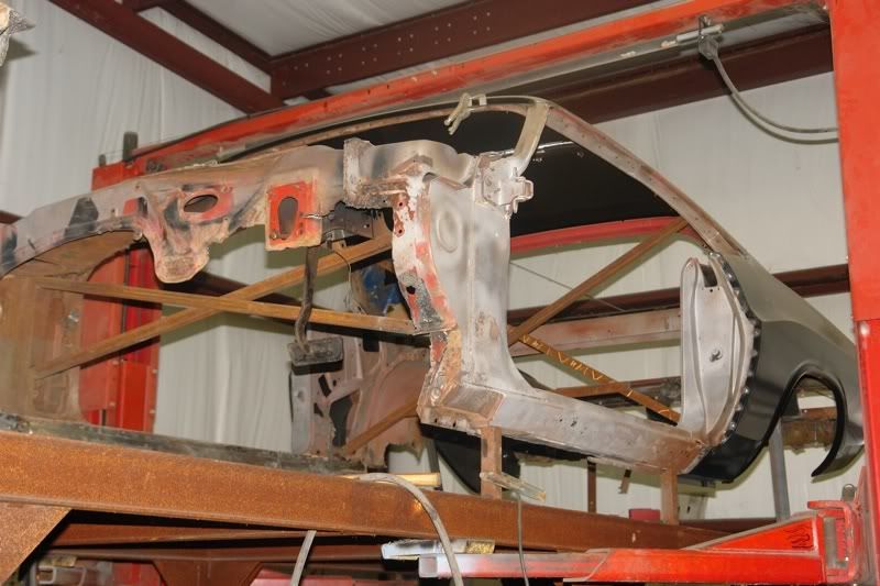 So now what do I do!! Well I am already in the whole on the car, and already started this crap so lets take it the next step. With the Caliber of car I am wanting to build I felt it a true nessescity to replace all teh sheetmetal. Quarters, roof, filler, and upper firewall are on order. So basically this is how the car sits as of last night at 7 PM. There are still a few hundered spot welds to drill out to get teh flanges or the quarters off, but was able to find that most of the inner structure is perfect.