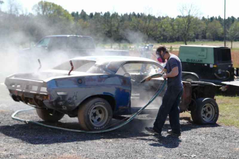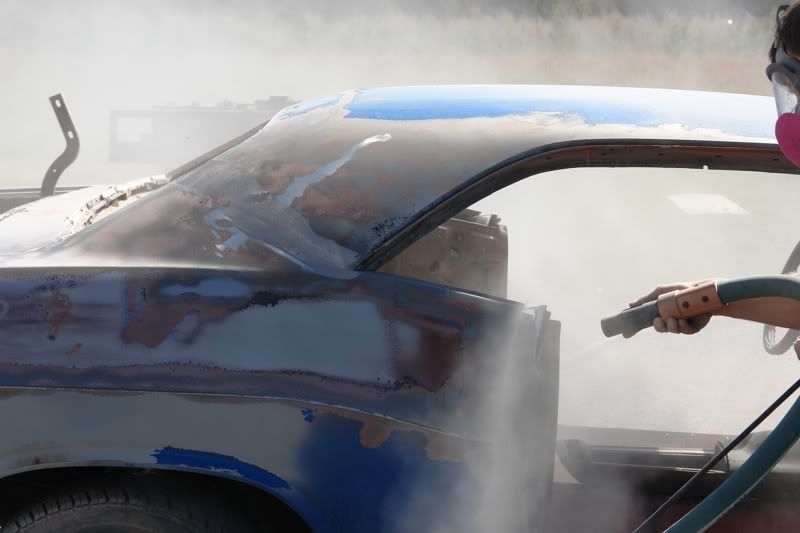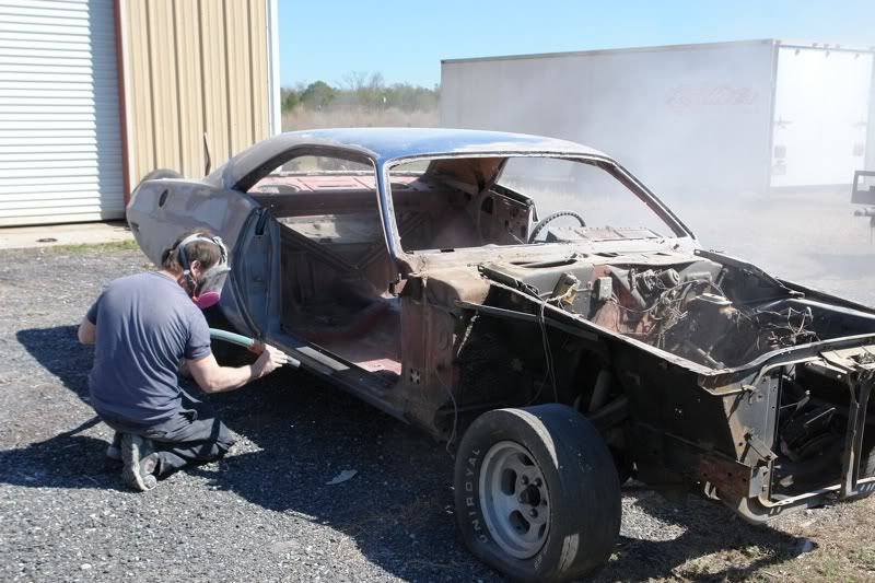 Wow what a day!!! Started this morning, finishing the stripping and getting out the motor and tranny. My buddy mike showed up after unch with his mobile media blaster setup, and we got busy. A couple hours later we had a clean , paint free car. But boy was there some surprises to be found. For the first time out of all the cars I have ever bought, I got the shaft and they didn't even lube it up. Once all the bondo was stripped , we had swiss cheese lower quarters. Seems that somewhere back in the 80's did the motor swap, and did some ghetto bondo work on the quarters, that continually spread under the paint. Well b 4 we were done blasting ,and by 6 it was sitting naked with no roof or quarters. So looks like in the morning I'll be headed to Goodmark for quarters, roof, and rear filler panel. With the calibur of car I am wanting to build I think full quarters and roof, will be much more professional and a whole lot better. I got a ton of pics I'll post up in the morning when I get in the office.