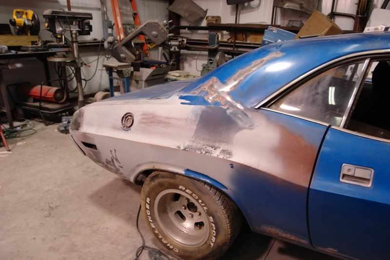 What a night!!!! Been working since about 6 PM on the car. She is completely gutted and nothing but a shell now. Found some stuf I am not real happy with, but I guess its to be expected for a 38 yr old car. Seems she was a 70's or 80's repaint, and 440 installation. Found some filler, rust and ghetto metal fixes in the back glass surround area. All in all just playing with the DA I am very happy with the condition. Maybe 10 1/16th inch rust holes in the quarters, a few in the lower driver fender, and about 4 inches of pitting and repair needed in the lower rear window area. Other than that its solid.