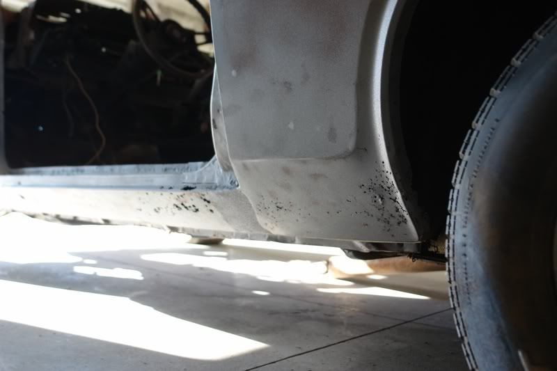 Well I spent a good majority of this weekend, building rockers. Spent friday evening patching the outer rocker rust areas, and banging out a few dents and dings. Then Saturday designed, built and installed the new inner rocker structure. Teh new innner rockers are made from 3/16 plate steel, the was broke with a 1.5 inch lip that is attached to the inner portion of the lower lip of teh original rocker where there used to be a pinch weld. They then extend upwards 4" and are then tied back into the upper area right below the upper pinch weld. This gave the car a ton of strength, and some sturdy mounting points for the new frame. All I can do now is hurry up and wait, as the wheels, brakes, and tranny are all riding around on the brown truck somwhere. once the wheels arrive I'll mock them up, take some measurements and start fabbing a chassis. I hop eto have this thing on the ground by end of next month.