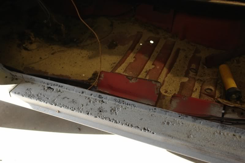 By sunday morning it was a shell. After Church my buddy Mike showed up with his mobile media blasting setup. Time to get dirty and down to business.
