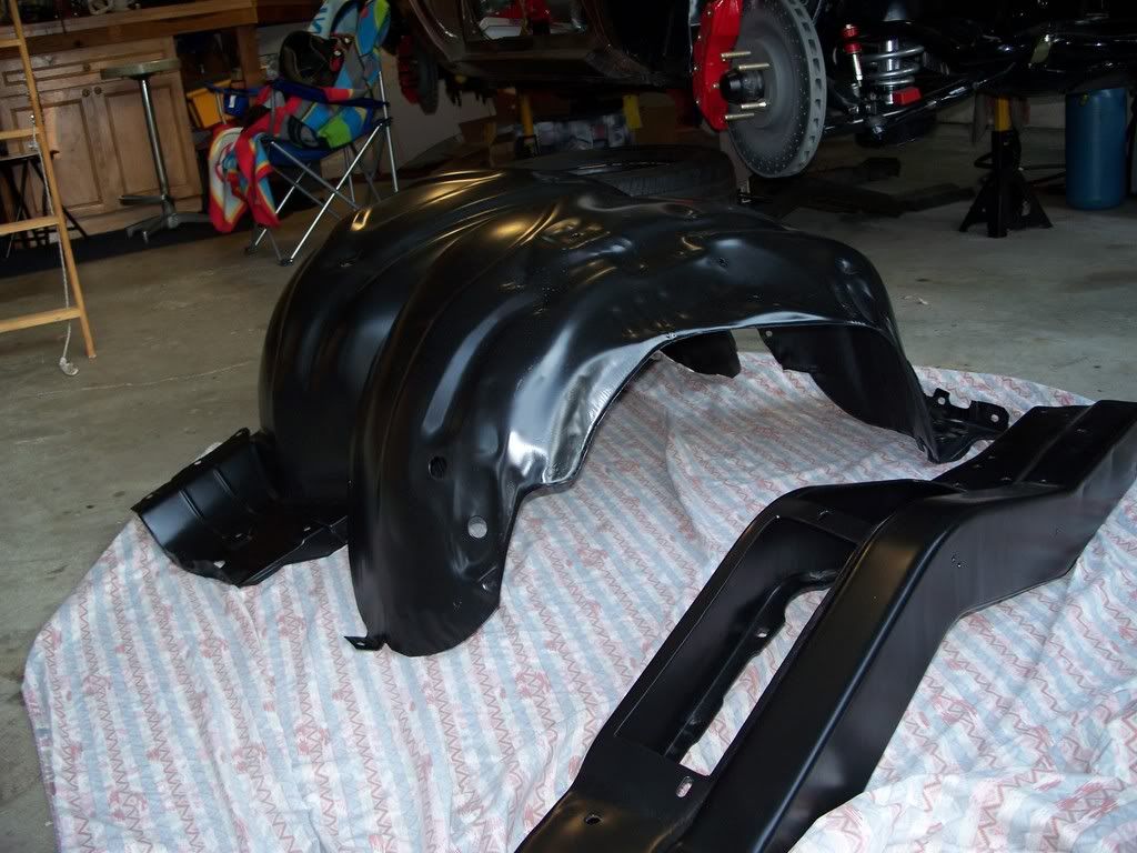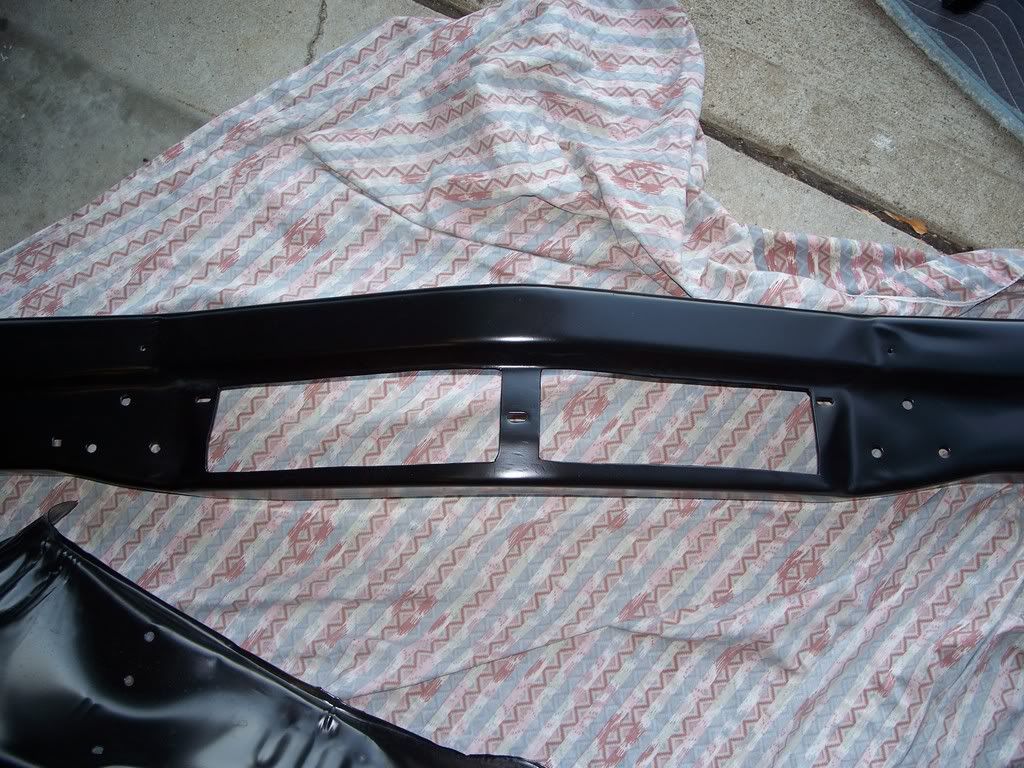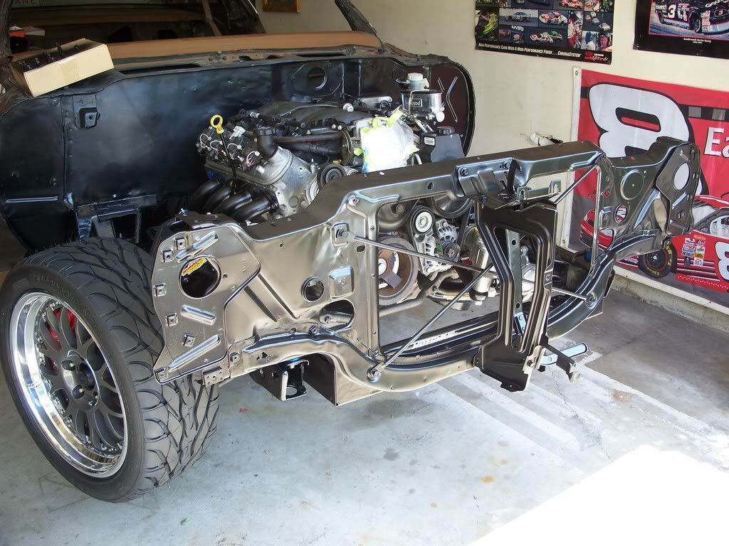 Have not done much as I cut a tendon in my left hand and have not been able to use it for the past three weeks and still have about two more to go but I still get around and work on the car just dont tell my Doc got the core/support back from powder coating and you can see were the blasting broke threw were the battery had been leaking, but not much i can do about that now. at least you wont see it, along with the hood hinges.I also had sent out my LS1 T/B to be ported, and to have the cross shaft and bump stop mod done to it and I think that it came out real nice, for those that know about the rear brake situation iam having to get a machine shop make the rear t-bolts that i need for the KORE3 e-brake kit to work with the big ford bearing on my moser 12 bolt but i should have it together next week but hear are a few pics of the parts on the car and still need some clips and stuff but i cant get those free from work will post up more whn it happens.