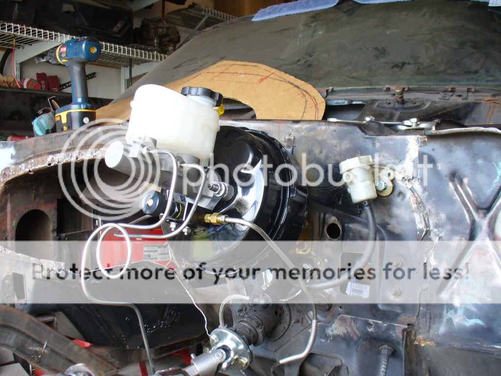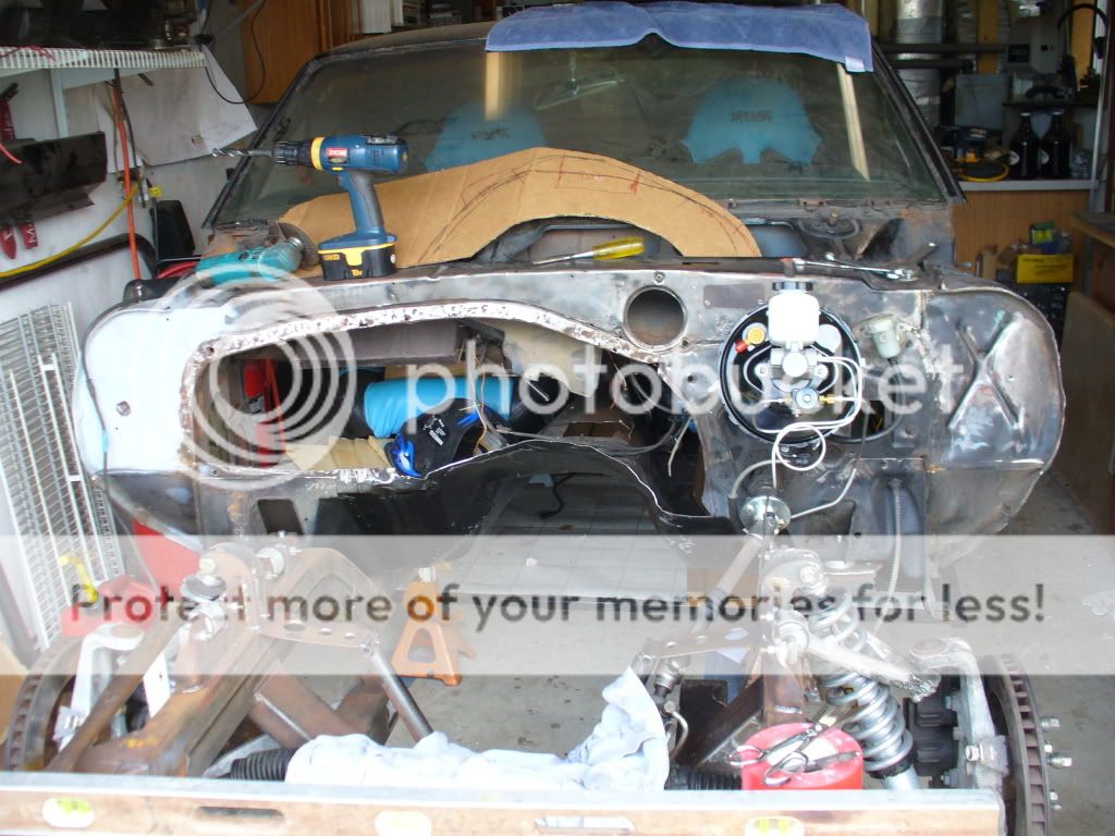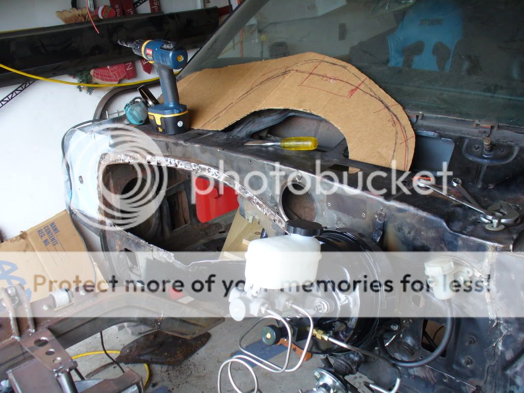 More updates.... I swear this build is going to be longer than Marty's Truck! After a long cold wet winter, I've finally gotten back on my project. I trailered the car to my local shop to check sqaureness and Alignment shortly after the first post. It came in 1/16 of being perfectly square, so I'm happy with how the suspension is turning out. Alignment specs are right where I wanted them, from +1 to -5 camber and Minimal Bump Steer. I pulled the motor and trans back out and am now doing the brake plumbing and smoothing the firewall. All the rear brake lines are done as well as the master cylinder, prop valve and the new Hydraulic Clutch assembly. I cut the old beat up firewall out and I'm going to make a new smoother piece. I'm also going to relief the section behind the motor about 1.5" for additional clearance. (the motor is set back about an 1 from stock) I'm not happy at all with the motor mounts, so I'm going to cut them out and make a new set with 1 3/4 DOM tubing, extending up to the shock mounts for additional support on the suspension.