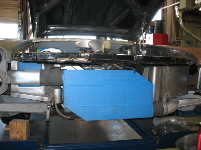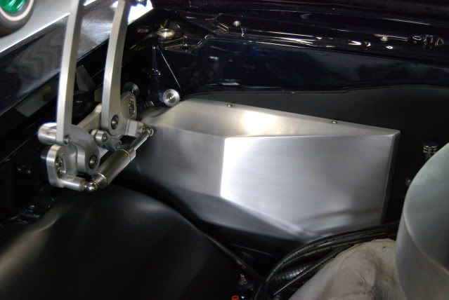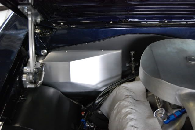 If you notice in some of the last posts the car had/has a chrome heater box. The heater box is really sentimental to the owner as he remembers when his Mom took the car apart to have it chromed so he wanted to keep it in the car. He did realize that it clashed with everything under the hood as the chrome just wasn't fitting in very well. Also, on top of that, he doesn't even want a heater (I'm not sure why). So I came up with this aluminum cover that most people would probably think is the actual heater box. I also made it a little long to cover where the hoses would have hooked up to give the firewall a cleaner look.