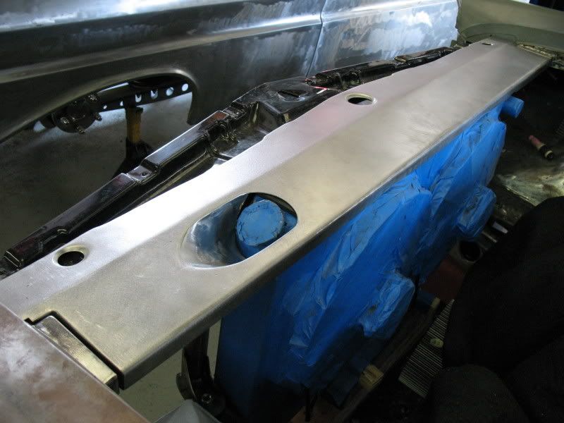 Here's an upper radiator mount/radiator support cover we're fabricating. We had to open up the frame horns a bit to run an over-sized Ron Davis dual pass radiator. The sheetmetal piece spans the width of the car and really cleans up that first impression when you open the hood.