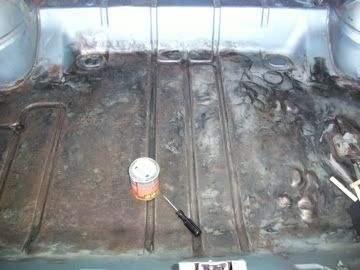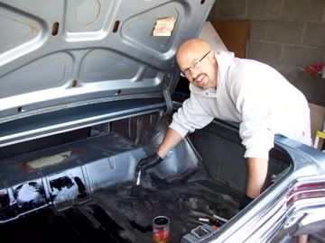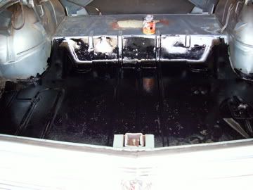 Since the weatherstripping was old, cracked and generally dried all to hell, I replaced every seal with a complete kit from SoffSeal but not before the dried up trunk seal allowed enough moisture in to make the trunk floor a little scaly so I stripped the floor and painted it up with a quick coat of POR 15. This is supposed to be the rusty sheetmetal one-time-fix cure-all. Just keep it off your skin or anything else you don't want to be black forever! They even warn on the can to keep it out of the grooves of the can or the lid will go back on permanently.