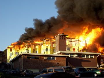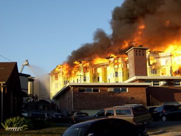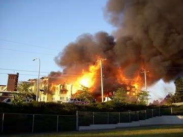 We were making good progress when we noticed sunlight going away but there wasn't a cloud in the sky so Chris (YouthPastor) looked out from the driveway and crapped his pants when he saw the cloud of smoke billowing into the sky from this 5 alarm fire a half mile down the street. Well, being boys, we had to go see it and it was the biggest fire I've ever seen. 5 story 120 unit apartment complex that had been under construction and was fully erected, sheeted and roofed and was ashes in an hour.