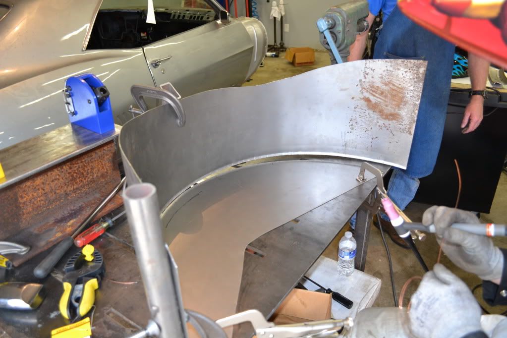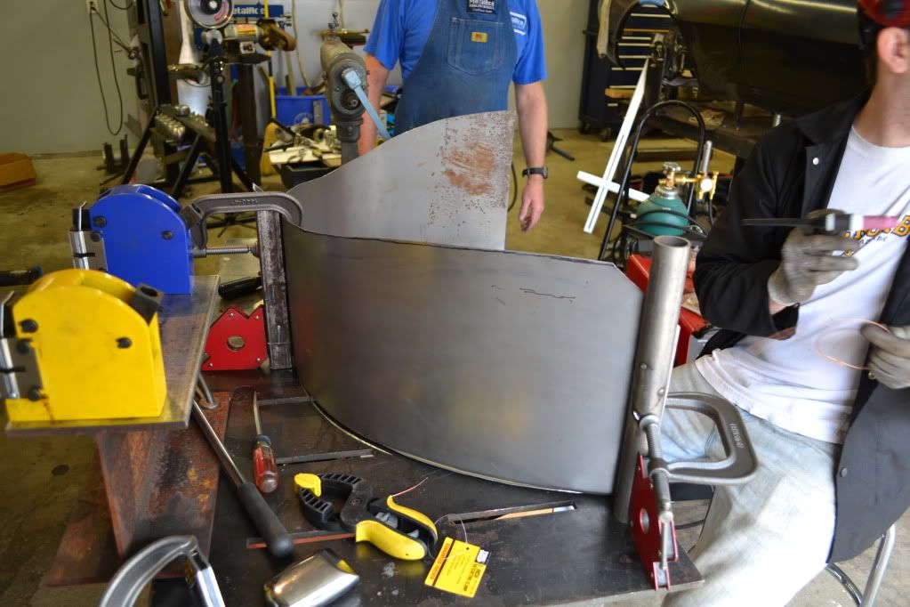 Here we got the pieces up in the car to test fit and figure out what we need to do before we weld them. http://i238.photobucket.com/albums/f...4/DSC_0126.jpg http://i238.photobucket.com/albums/f...4/DSC_0127.jpg Here we are getting ready to tack the halves together. We used a round over die on each piece to form a radius in the corners http://i238.photobucket.com/albums/f...4/DSC_0131.jpg http://i238.photobucket.com/albums/f...4/DSC_0130.jpg Got the both sides tacked together and flanges made and all set in place. Just some minor trimming left and start to lay out the rest of the floor. http://i238.photobucket.com/albums/f...4/DSC_0137.jpg http://i238.photobucket.com/albums/f...4/DSC_0135.jpg |